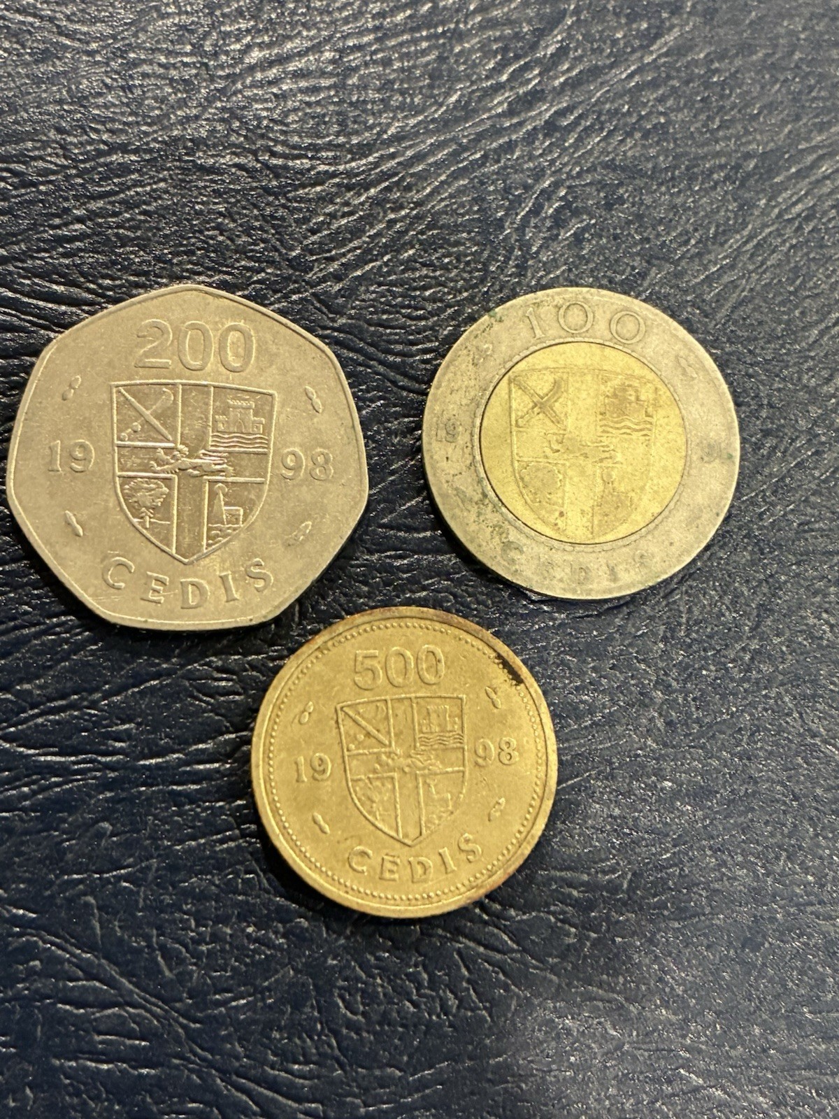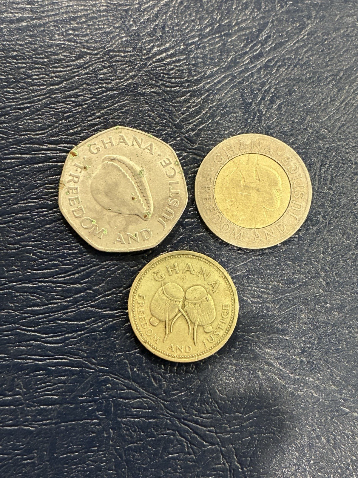 Description: The 100 Cedis coin is from 1991 and is fairly worn on one side (unsure which side is the obverse and which the reverse on these), the 200 and 500 coins are from 1998. The 200 has patina growth on one side, and the 500 is fairly clean.