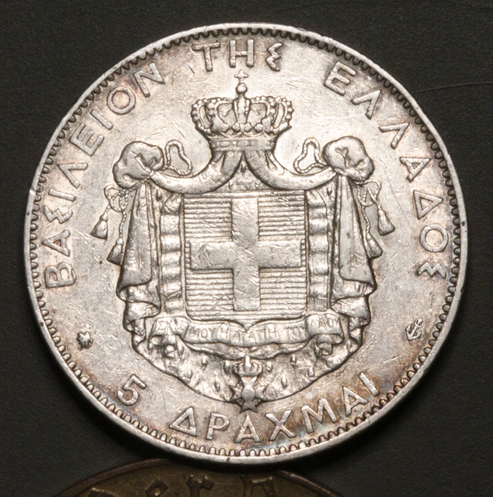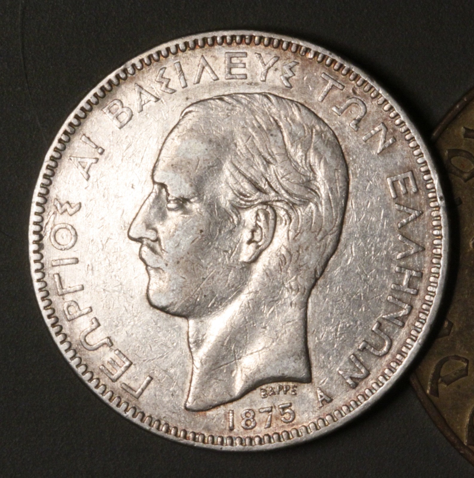 Description: This is an 1875 Greek 5 Drachmai coin. It is made of. 900 silver. I would call it an XF. See detailed pix.