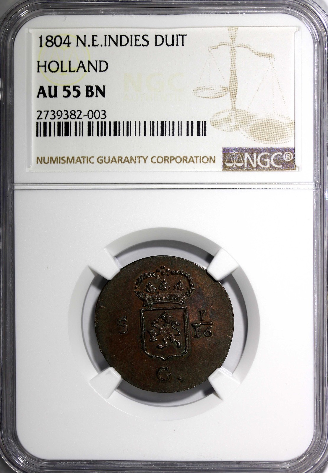 Description: $Netherlands East Indies HOLLAND COPPER 1804 1 Duit GRADED NGC AU55 BN TOP GRADED COIN BY NGC KM# 76 Obverse: Inscription, date below Obverse Inscription: INDIAE / BATAV: Reverse: Crowned States General arms divide value Please check out my other listings and we will be happy to combine in one package ! YOU WILL RECEIVED THE SAME COIN AS PICTURED. ALL COINS ARE AUTHENTIC AS DESCRIBED.