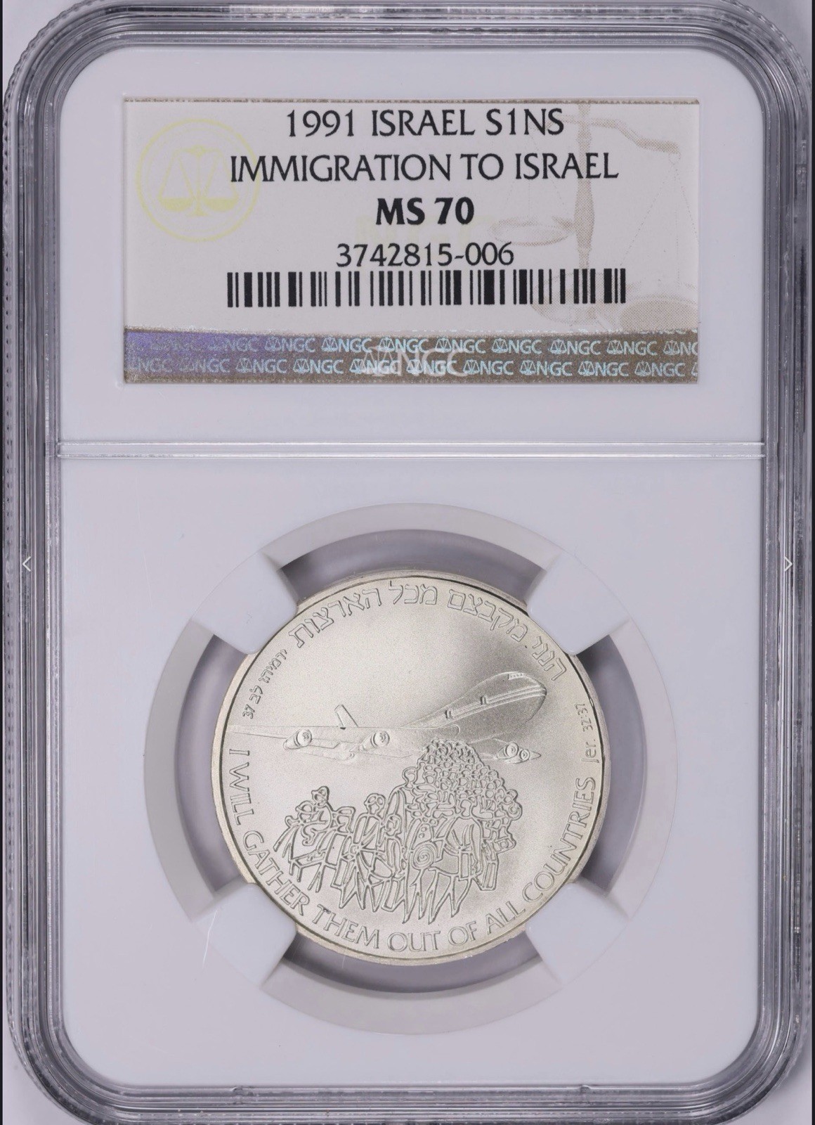 Description: The product is a 1991 Israel Silver New Sheqalim coin graded as MS 70 by NGC. This uncirculated coin has a denomination of 1 New Sheqalim and is composed of silver. 1991 Israel Silver 1 New Sheqel – Immigration to Israel.