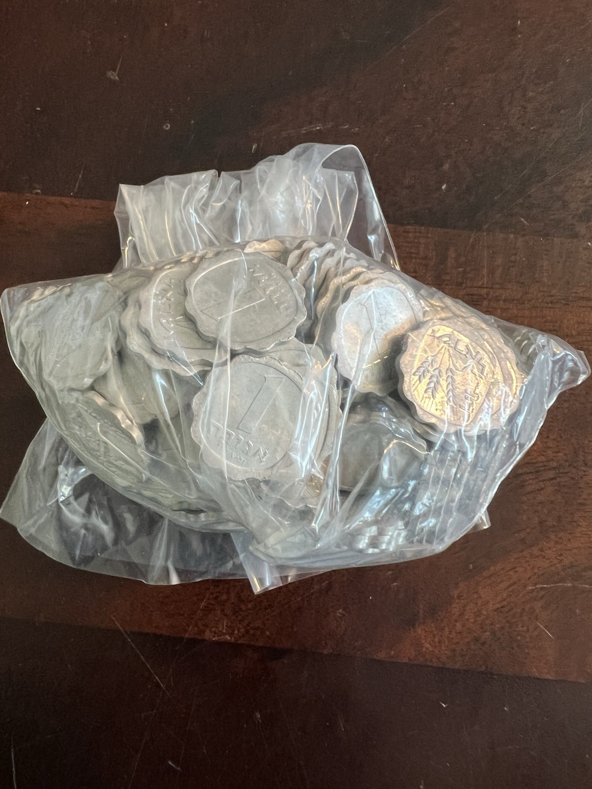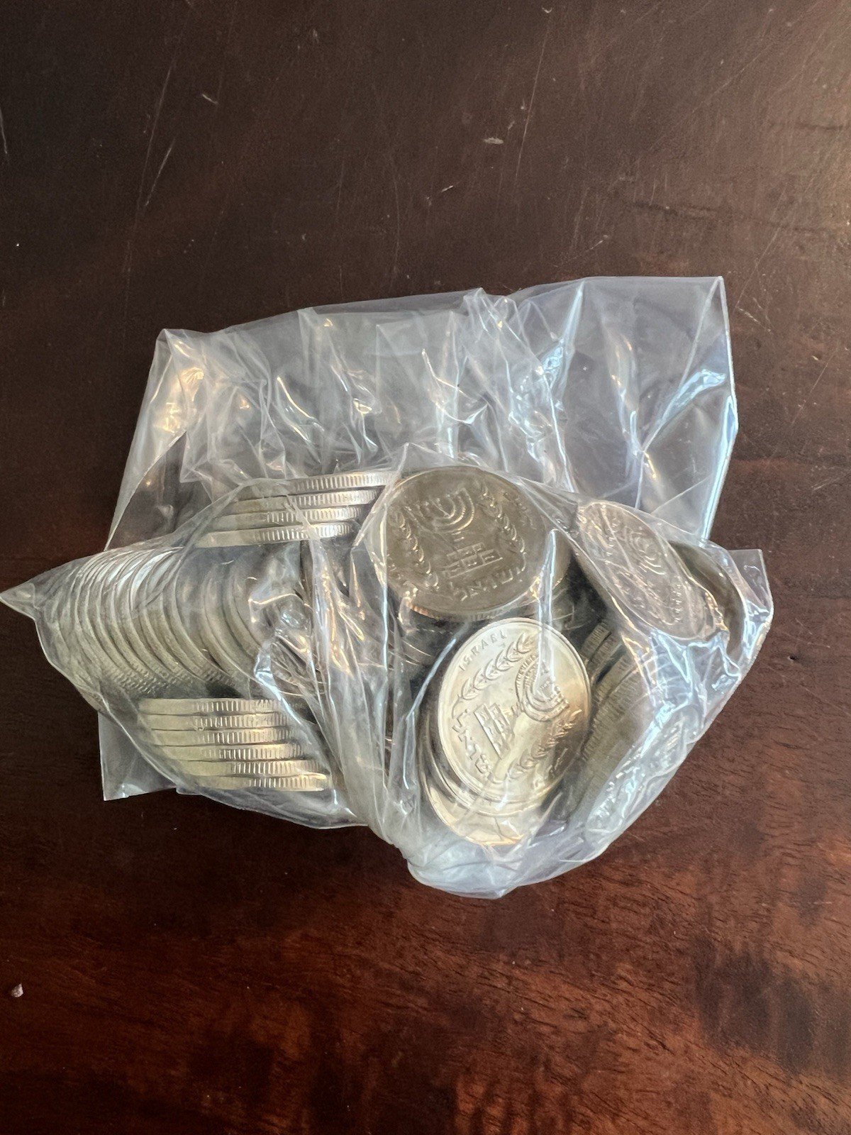 Description: Mixed bag of Individual bags of 1967 Israel coins – 1 Agorot, 5 Agorot, 10 Agorot, 25 Agorot, 1/2 Lira, 1 Lira. Unknown number of each. Total bag weight = 5 1/2 pounds.