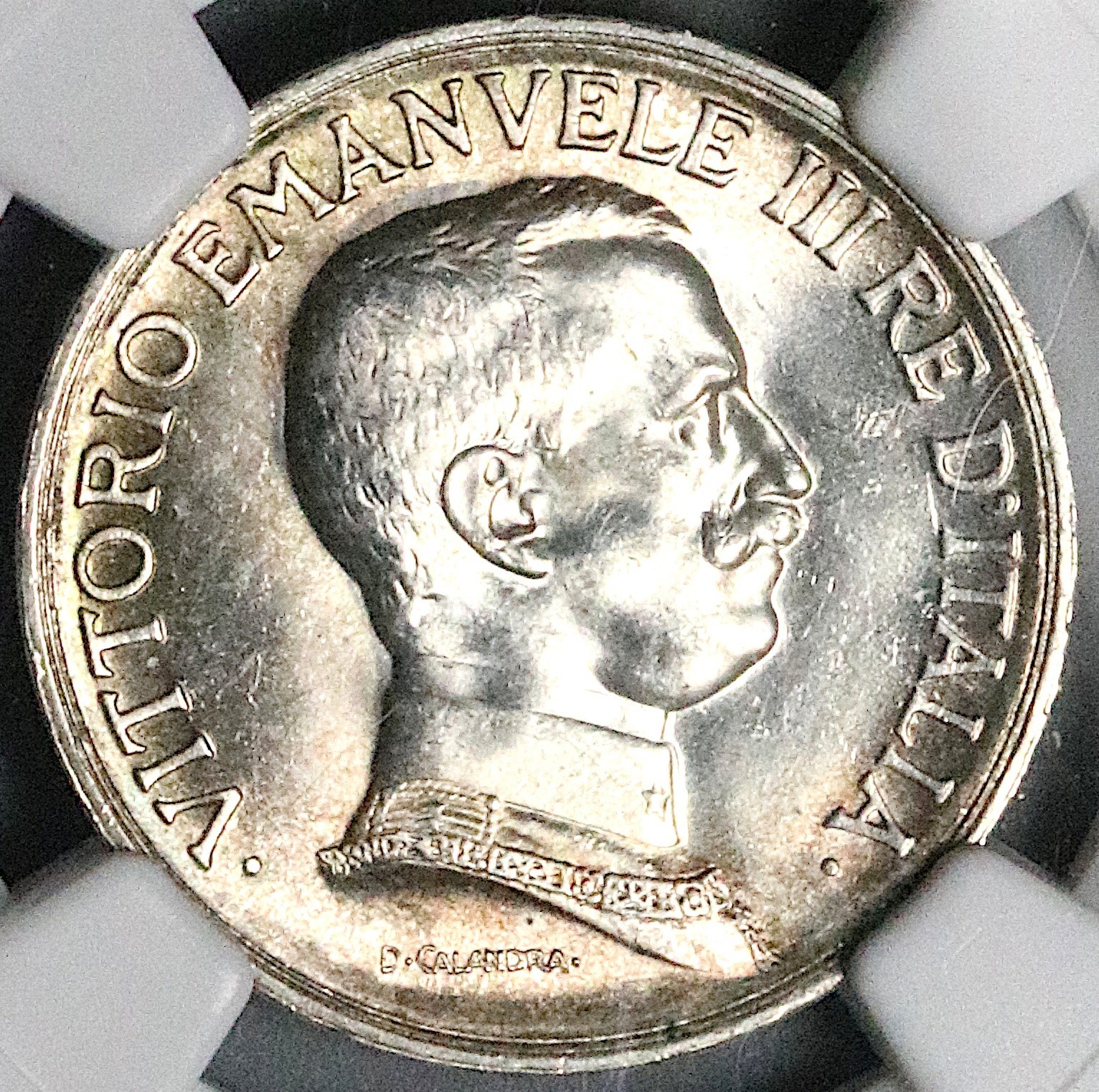 Description: Gem Mint State Uncirculated Italy silver 1 lira coin. Last year for silver lira coin. Classical Roman style quadriga chariot reverse type.