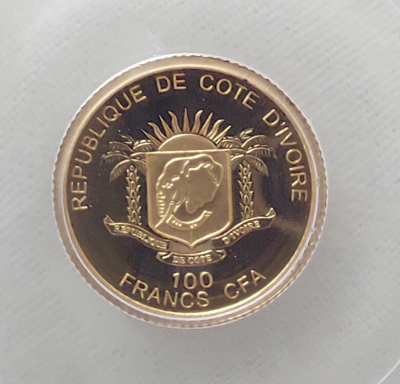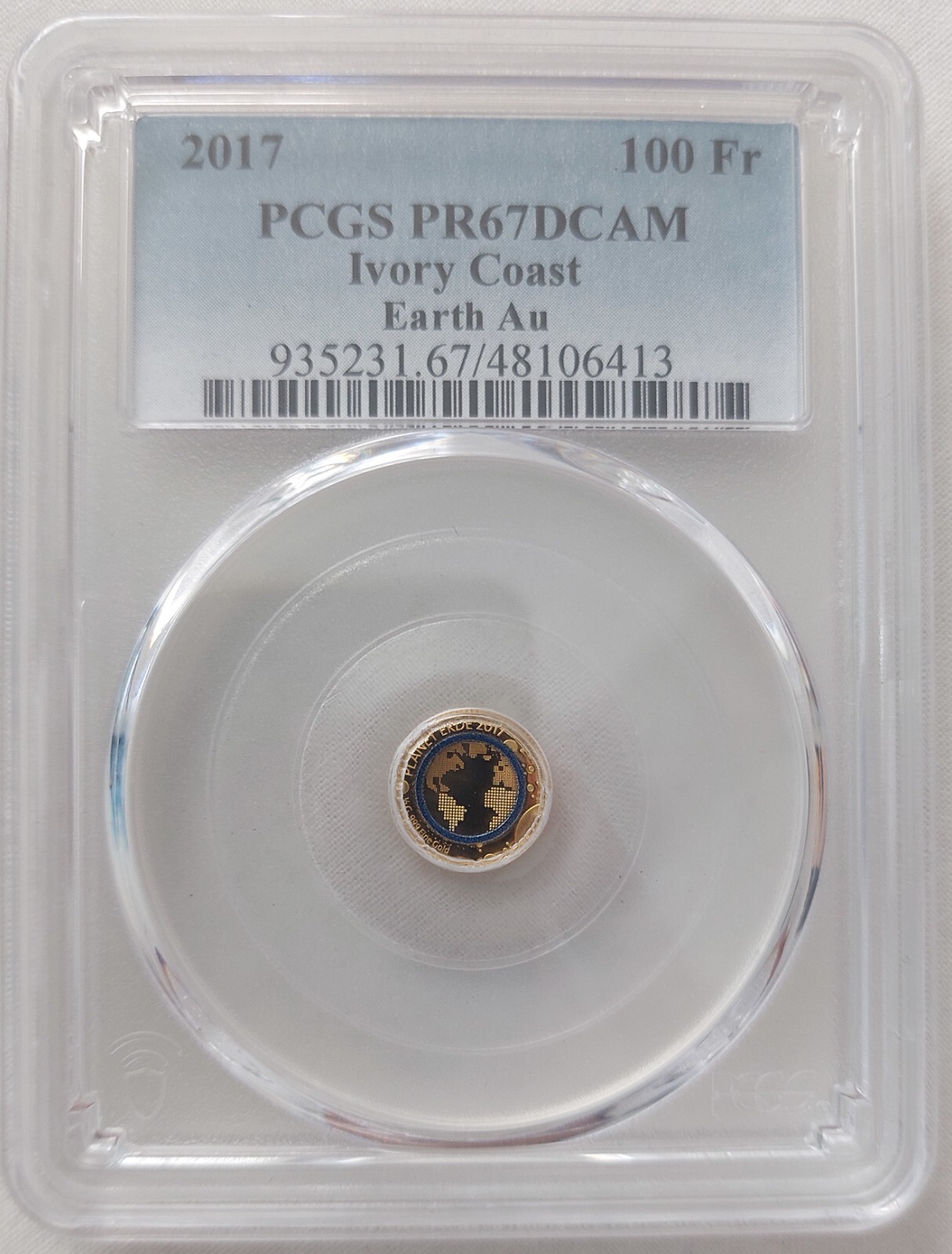 Description: IVORY COAST GOLD 100 FRANCS PROOF COIN. PCGS GRADING PR67DCAM. EARTH PLANET SPACE.