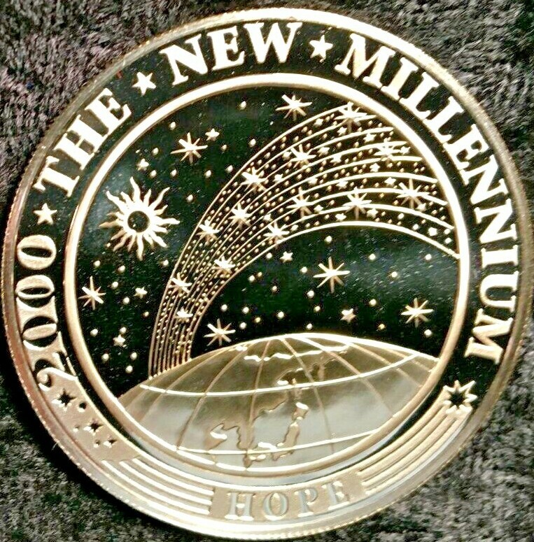 Description: This is a 2000 Kiribati New Millennium Proof. 3536 oz. Perfect for adding to a collection of Pacific Islands coins. This proof coin and displays the world, with stars overhead as well as the sun on the obverse, while the reverse shows the countries shield and the denomination.