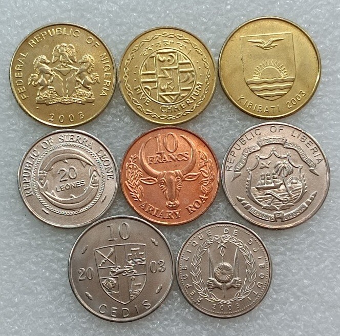 Description: 8 Monkey coins from NIGERIA LIBERIA MADAGASCAR GHANA DJIBOUTI SIERRA LEONE BHUTAN KIRIBATI, all dated 2003 and in UNC condition, they are Djibouti 10 Francs KM36; SIERRA LEONE 20 Leones KM295, BHUTAN 5 Chhertum, KIRIBATI 5 Cents KM40.