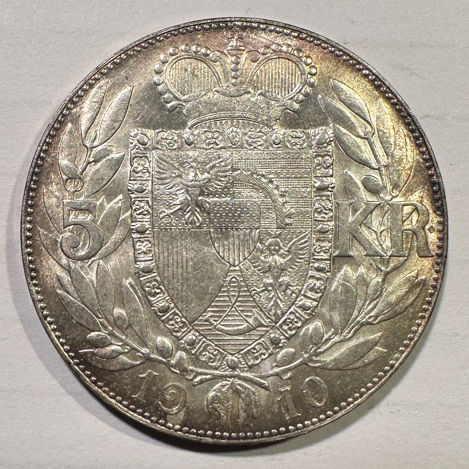 Description: The product is a 1910 Liechtenstein 5 Kronen Silver Crown featuring Prince Johann II. This very scarce type coin is in high grade and made of 90% silver. It is uncirculated, uncertified, and has a fineness of 0.9. This collectible item holds historical significance and is a valuable addition to any coin or paper money collection.