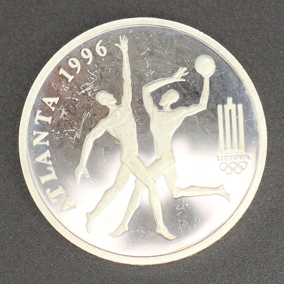 Description: The obverse of the coin features the Coat of Arms of the Republic of Lithuania inside a shield with floral motifs on both sides. Lettering: ATLANTA 1996. TypeNon-circulating coin. LMK Lithuanian Mint (Lietuvos Monetu Kalykla), Vilnius, Lithuania (1990-date).