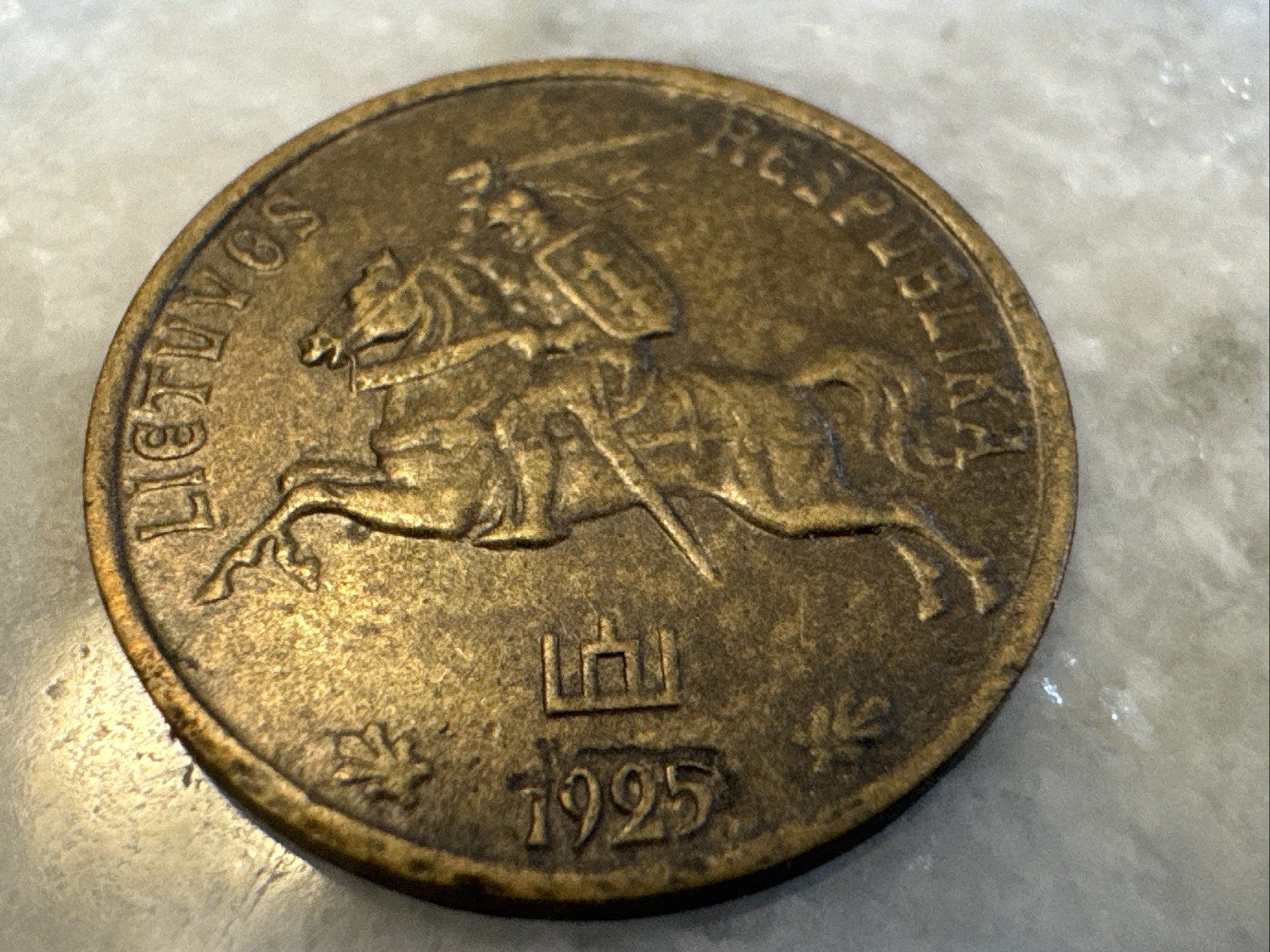 Description: The product is a 1925 Lithuanian 5 Centai coin featuring a knight on horseback. This historical coin from Europe is sure to be a unique and valuable addition to any coin collection. With its rich design and significance, this coin captures a moment in time and represents the cultural and economic landscape of Lithuania during that era.