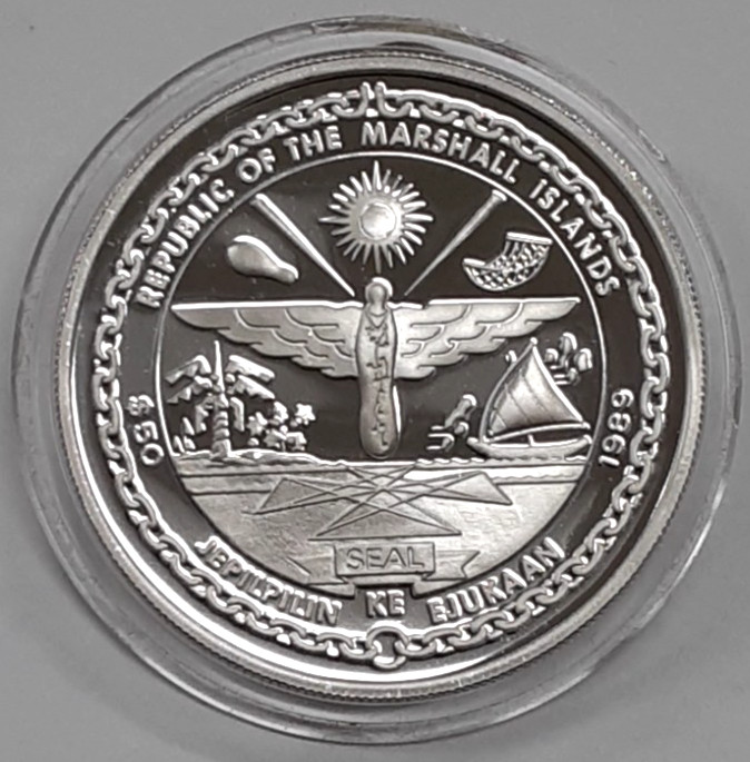 Description: 1989 Marshall Islands 50 Dollar .999 Silver coin struck to commemorate the 20th Anniversary of Apollo XI that landed the First Men on the Moon in 1969. Coin is Gem Proof and comes in a capsule. Shipping is combined and orders over $100 ship free.