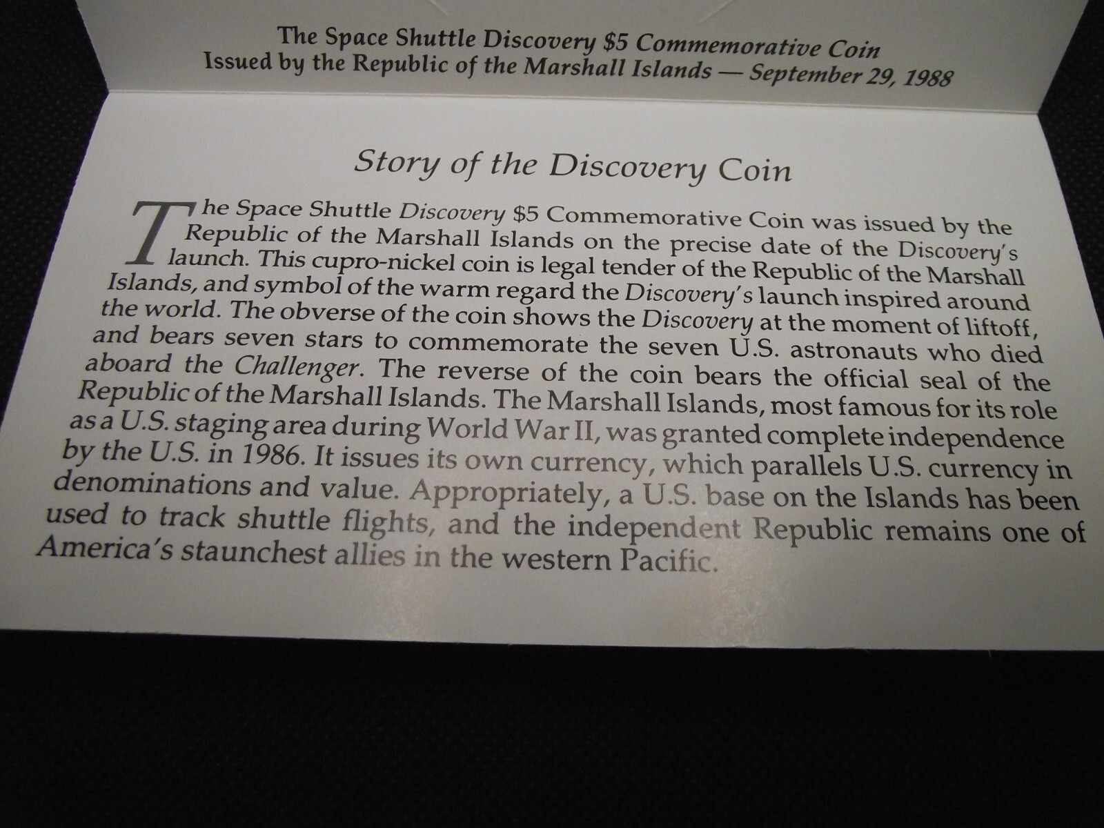 1988 Republic Of The Marshall Islands Space Shuttle Discovery $5 Coin and Card