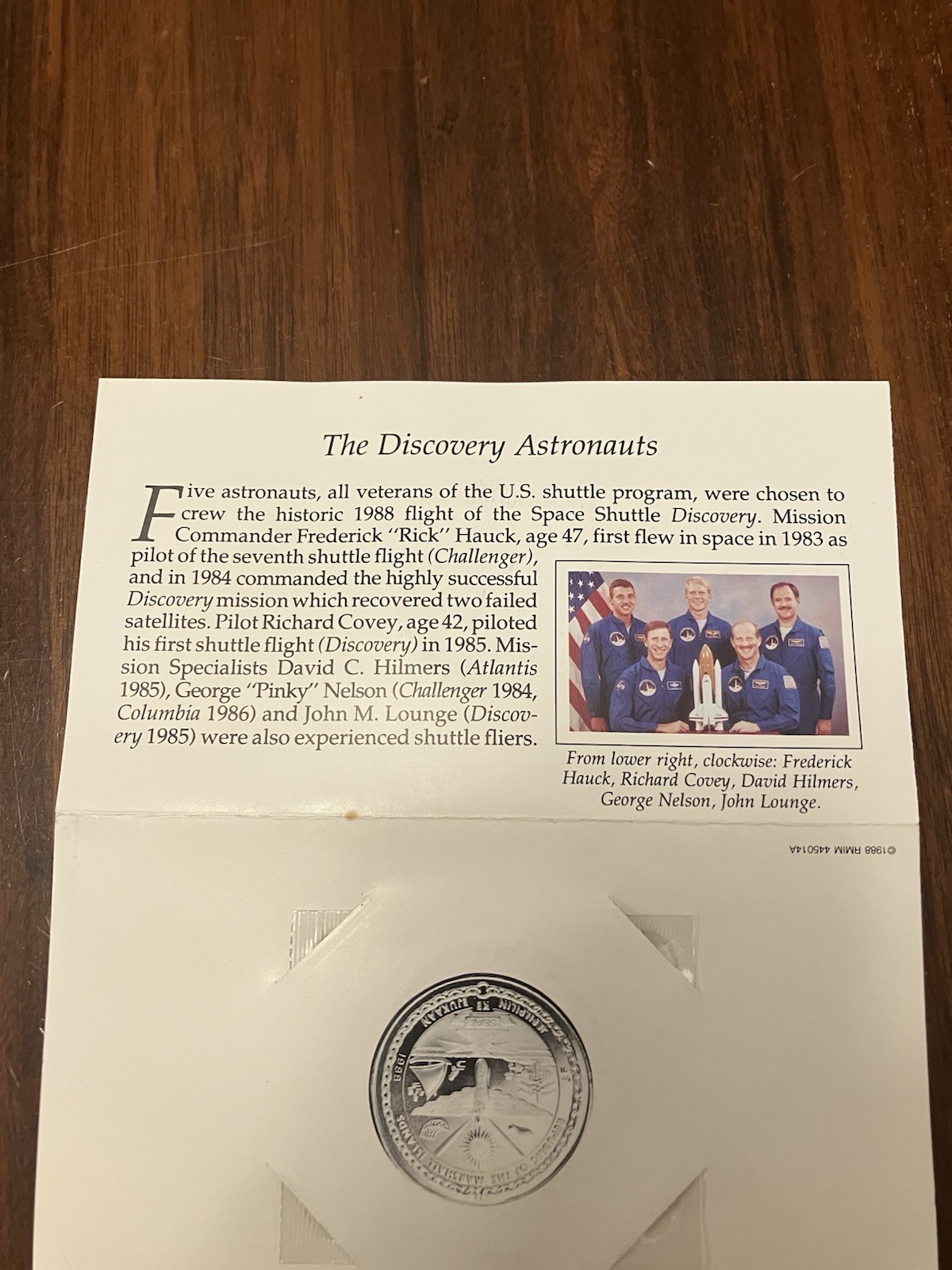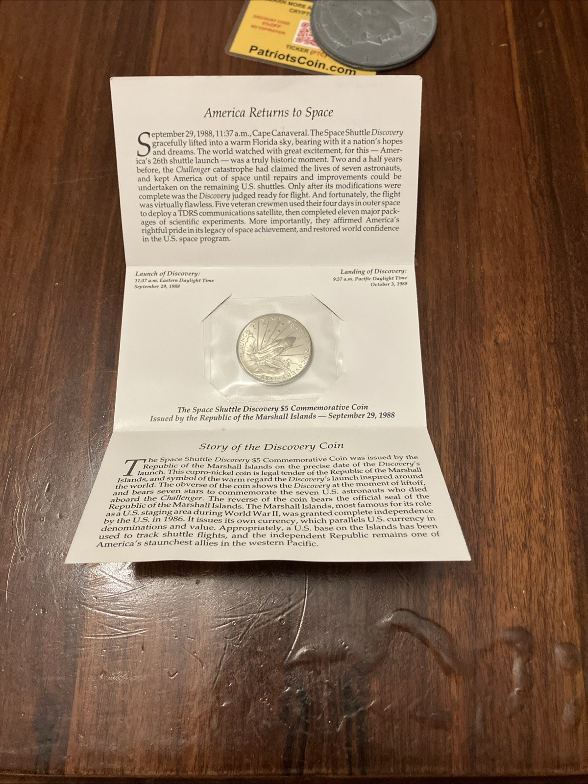 Description: The Marshall Islands 1988 Commemorative Coin Space Shuttle Discovery is an uncirculated coin featuring a commemorative design in honor of the Space Shuttle Discovery. Made of copper-nickel with a silver color, this coin was issued in 1988 and is uncertified. Its variety as a space shuttle commemorative adds a unique and historical value to this collectible item.