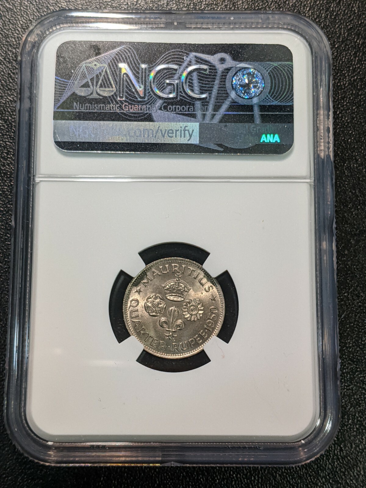 Description: Up for sale is a 1950 1/4 Rupee Coin from Mauritius. NGC has certified this coin as being authentic and in MS65+ condition.
