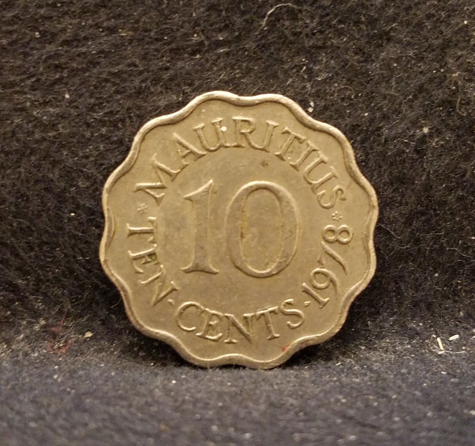 Description: KM-33, 1978 Mauritius 10 cents; copper-nickel, scalloped flan, plain edge; Elizabeth II, decent circulated, see high resolution scans to estimate condition yourself and pictures for the overall look and feel.