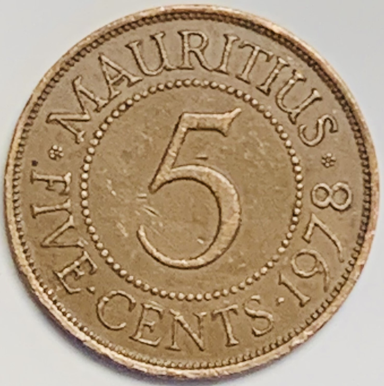 Description: Circulated Condition. 1978 Mauritius 5 Cents.