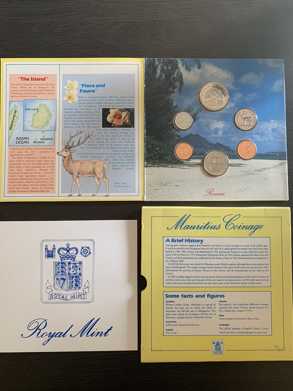 Description: A collection of brilliant uncirculated coins, produced by the Royal Mint of Great Britain, for the island nation of Mauritius. All coins are sealed in the original packaging, which also includes art, photos, and facts about Mauritius. The set includes one of each of the following coins: – 5 Rupees – 1 Rupee – Half Rupee – 20 Cent – 5 Cent – 1 Cent There is slight wear and discoloration on the outer jacket, and very slight wear on the inner packaging. The coins have never been removed from their protective plastic and appear to be without blemish. Ships FREE Continental US only (please contact me if interested in shipping internationally). Thanks for looking!
