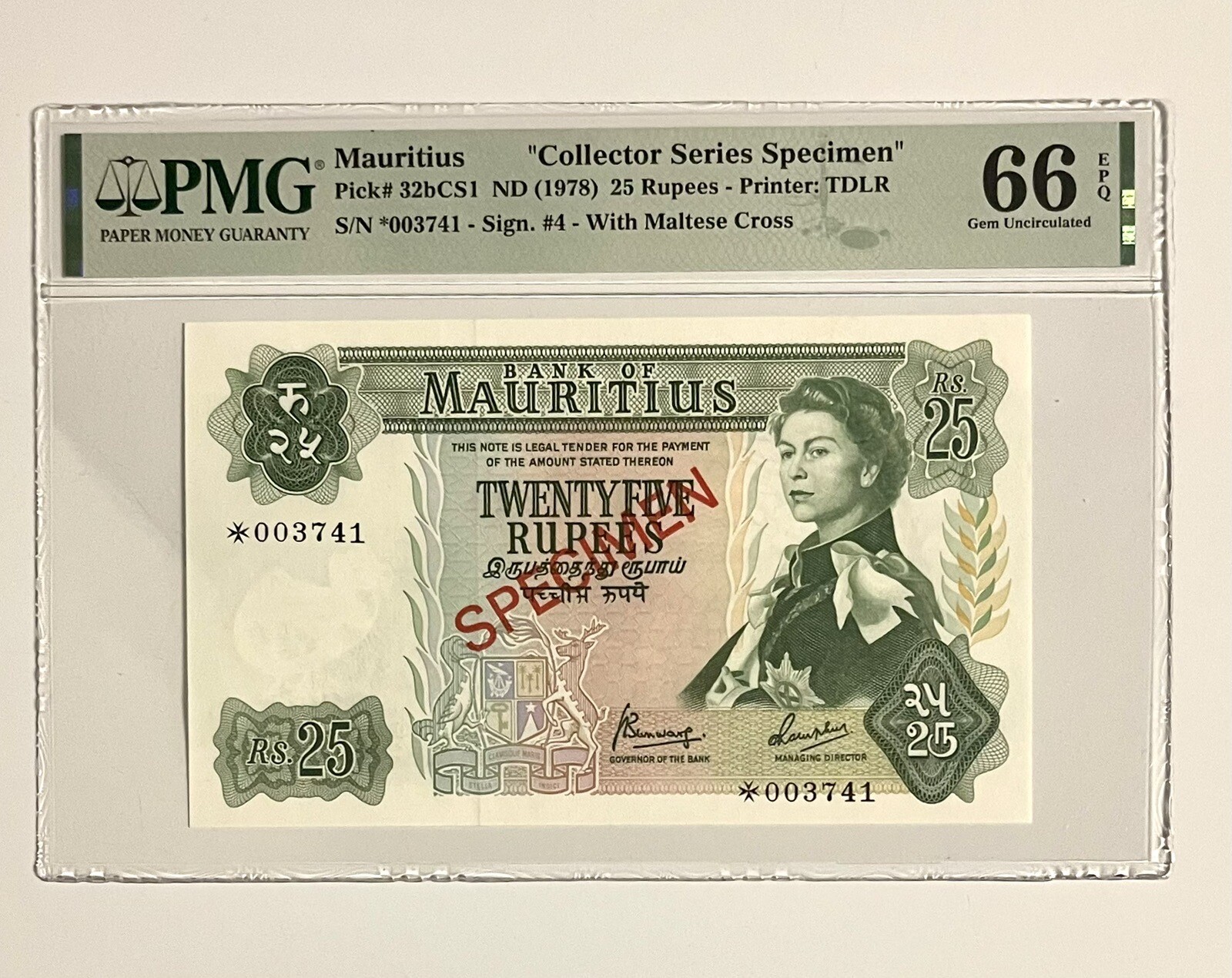 Description: This Mauritius Franklin Mint 25 Rupees banknote is a rare find for collectors of paper money from around the world. With a PMG 66 EPQ Gem Unc certification number of 2180407018, this banknote is a true gem for any collection. The banknote is from the year 1978 and features a stunning design that showcases the unique beauty of Mauritius. This banknote is perfect for collectors of all levels who are looking to add a rare and valuable piece to their collection. The banknote is in excellent condition and is sure to be a standout piece in any collection. Don’t miss this opportunity to own a piece of history!