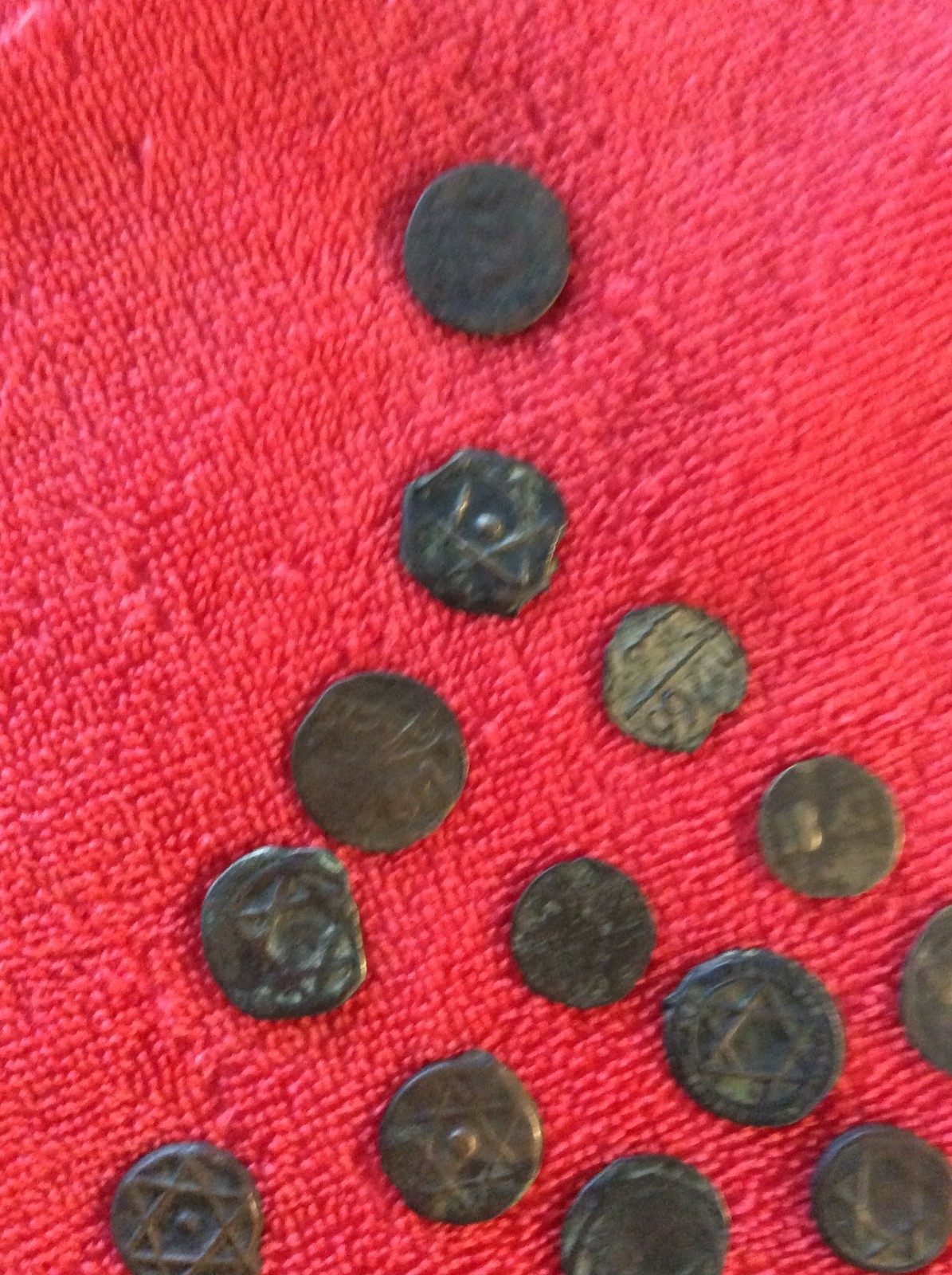 Description: 10 MAZUNAS. FALUS ANCIENT. MOROCCO COINS. I FOUND THESE AT AN ESTATE SALE AND I AM NOT SURE EXACTLY WHAT THESE ARE. STAR OF DAVID.