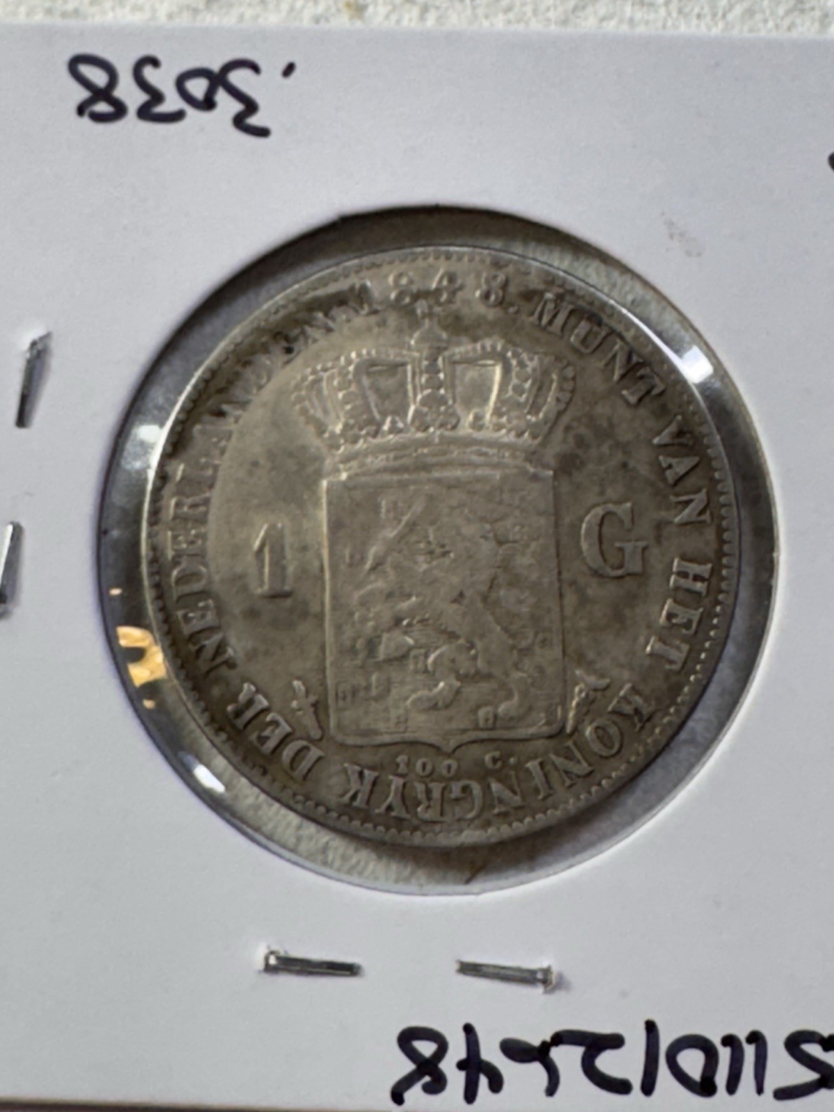Description: 1848 Netherlands 1 Gulden Cleaned. The coin in the photos is the coin you will receive.