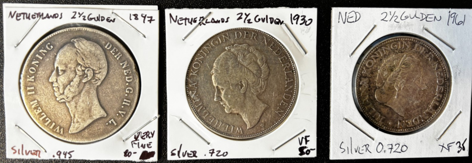 3 x 2-1/2 Gulden Netherlands Silver Coins (1847 1930 and 1961) Current Price: 132,97 USD Location: Canada Type: Fixed Price Description: More like this:1635 Netherlands Lion Dollar Gelderland Silver Coin KM 15.1 Daalder CirculatedNetherlands Utrecht Ducaton Silver Horse Rider 1791 VF HoleNetherlands Wilhelmina era 1915 silver Gulden nicely toned XF with orig patina1955 Netherlands 1 Gulden Silver Coin - High Grade - Ships Free1914 and 1971 Netherlands 5 Cent CoinsNETHERLANDS - SILVER 10 CENTS GIRL 1897Netherlands 1917 1 Gulden Silver Coinutrecht dukaton Large Dutch silver coin. never cleaned knight on horse and lionCoins of the Netherlands 6 Coin Set Uncirculated 19801724 Netherlands 2 Stuivers Akerendam Shipwreck NGC UNC Details Holland SilverNetherlands - Zeeland 6 Stuivers 1762 Stuiver Sailing Galleon Ship Silver RareNetherlands : 1918 10 CENTS and (2) 1944 10 CENTS SILVER LOT OF 3 COINS2 One Gulden 72% silver coins 1931and1940 NetherlandsLot of 20 pieces Netherlands East Indie 1 Duit Uthrecth 1790 VOC CoinsNetherlands 1960 and 1962 2 1/2 Gulden KM#185 two silver coins. C017VOC N.E. Indies Duit NGC Graded New York Penny Holland Utrecht Zeeland FrieslandNetherlands Gold Coins Graded NGC MS-65 10 GuildenNetherlands 1953 1 cent Bronze coinSILVER = 1.514 TROY Oz. ASW HUNGARY NETHERLANDS COINS 1849-1947 (0.640 FINENESS)2022 Netherlands 1 oz Silver Ducaton Rider Restrike BU - SKU#2460611921 Netherlands Silver 10 Cents - Lustrous High GradeLot of 24 Netherlands Dutch Foreign Coins - SilverNetherlands 1931 2 1/2 Gulden Wilhelmina Silver Coins.#385dNetherlands 1869 2-1/2 Gulden Silver Coin - Rare 0.945 Fine Silver CoinNGC MS64 1724 Netherlands Ducat Utrecht Gold Coin.! GEM BU.!1761 Utrecht Netherlands Silver Rider 1/2 Ducaton PCGS UNC Details Luster1930-1931 2.5 Gulden - Wilhelmina Netherlands 4 X Silver Coins*682021 Netherlands 1 oz Silver Lion Dollar PF-70 NGC (ER) - SKU#241439Netherlands 1916 - 1 Gulden - .945 SilverNGC UNC 1724 Akerendam Shipwreck 2 Stuivers Silver Dutch Pirate Treasure BU Coin1984 NETHERLANDS ANTILLIES 5 CENT COIN - #A59651734-1786 First New York Penny NGC Genuine NE Indies VOC Duit Zeeland Coin JR2001892 Netherlands 1 Gulden Head of Queen Wilhelmina Silver 0.947 Coin Km#1172 Pcs Authentic WestfriesLand Coin and Voc ½ Duit 1751 Hole In 1 FossiL Shipwreck1944 Netherland 10 Cents and Curacao 1/4 Gulden 2 Coin LotUnique 1-ducat gold 1724 Netherland UtrechtNetherlands East Indies JAVA Stuiver 2pcs 1818 and 1pcs 1798 super condition RRR !1650 Netherlands Utrecht Lion Daalder Dollar NGC AU58 - Incredible Strike!1621 Siege Julich Netherland and Spanish silver stuivers. from Antique collarNETHERLANDS SET OF 9 COINS (5 Silver) WITH MIXED DATES - Leather Style HolderNetherlands 1980 Gulden 152454 combine shipping1800s 1800's coin lot 14 coins brazil netherlands indies austria 1800-18981826 B Netherlands 10 Cents - Silver L21750 VOC N.E. Indies Duit NGC Genuine New York Penny Holland1770 NETHERLANDS - DUCATON SILVER RIDER COIN1793 Netherlands Utrecht Silver 3 Gulden1681 Netherlands Silver Lion Daalder VF-30 NGCTWO NETHERLANDS COINS 1941 and 1944 FREE SHIPPING1955 Netherlands Dutch 1 Gulden Coin- 0.72 Silver CoinNetherlands : SILVER COINS (9) - IN ESTATE SILVER BRACELET - #1376 Tags: Netherlands coins Read more articles Previous PostNetherlands 2-1/2 Gulden 1874 Silver Coin KM#82 T10105 Next PostLot 5 Netherlands and Curacao Silver Coins (1) 2.5 1931 (5) 1 Gulden Fineness .720