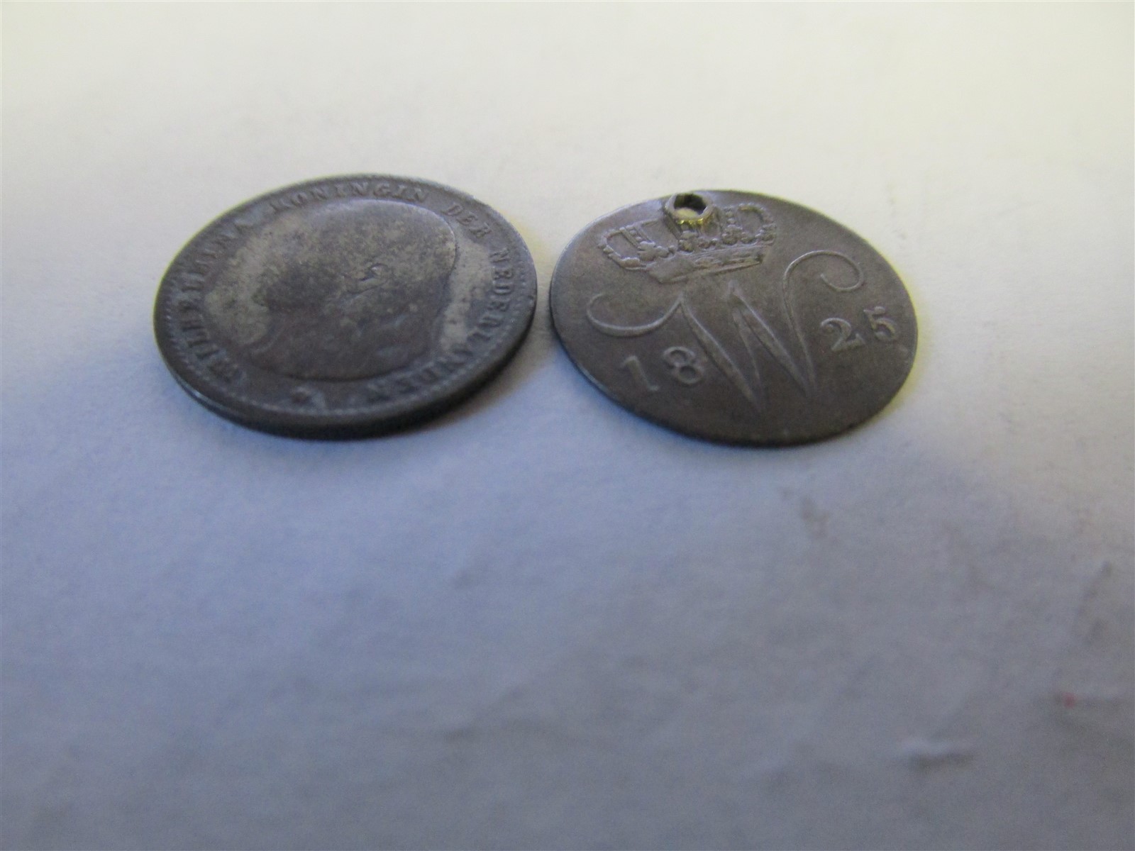 Description: lakeshore1225fxlot86jds20 This auction is for TWO silver coins from Netherlands. First is a 5 cent piece from 1825, holed, pictures Willem I, mintage approx 900,012 and this design was used from 1818 to 1828 and has a silver content of 0.569 (approx 0.846 grams), 15mm diameter. The other is a 10 cent piece from 1894, pictures Wilhelmina Queen of the Netherlands, mintage approx 1,500,000, and this design was used from 1892 to 1897 and has a silver content of 0.640 (approx 1.4 grams), 15mm diameter. BOTH coins on for one low price. You will receive the exact coins in the picture. NOTE: These coins were glued to a piece of paper and there is still some paper & glue residue on the coins. I don’t have the time to clean these off, I leave that to the new owner.