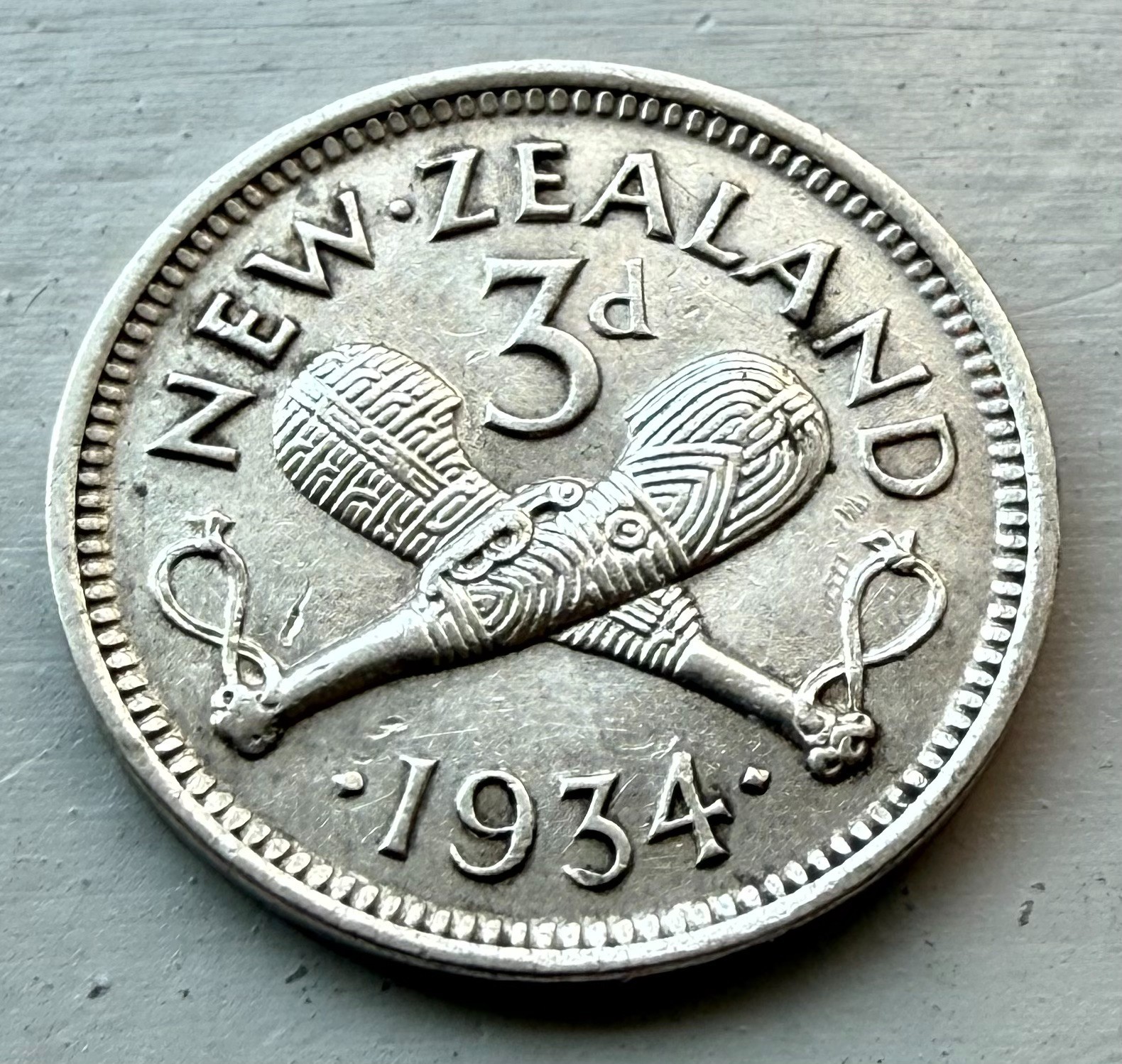Description: 1934 New Zealand SILVER 3 Pence ~ (AU) Condition ~ Small.