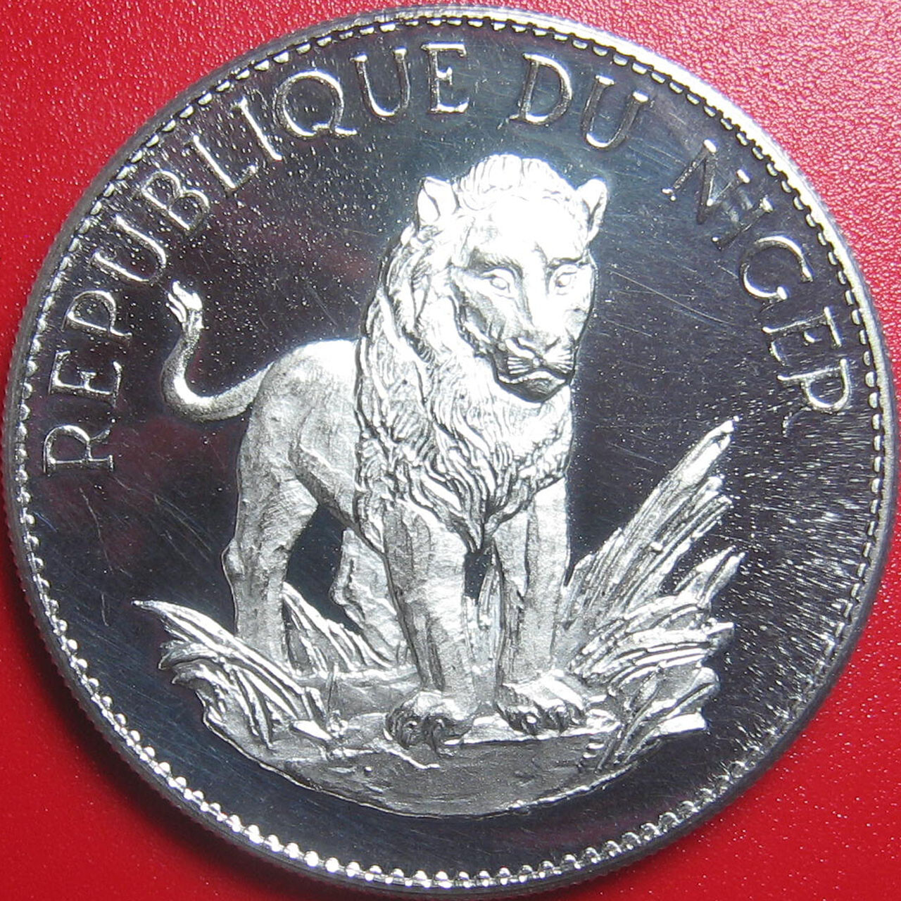 Description: ▣ Denomination: 10 Francs. ▣ Country: NIGER. ▣ Reverse: Lion. ⚜ B&D World Coins⚜. ▣ Year: 1968. ▣ Notes: Specks “as struck” and hair lines on on both sides of the coin. ▣ Quality: Proof.