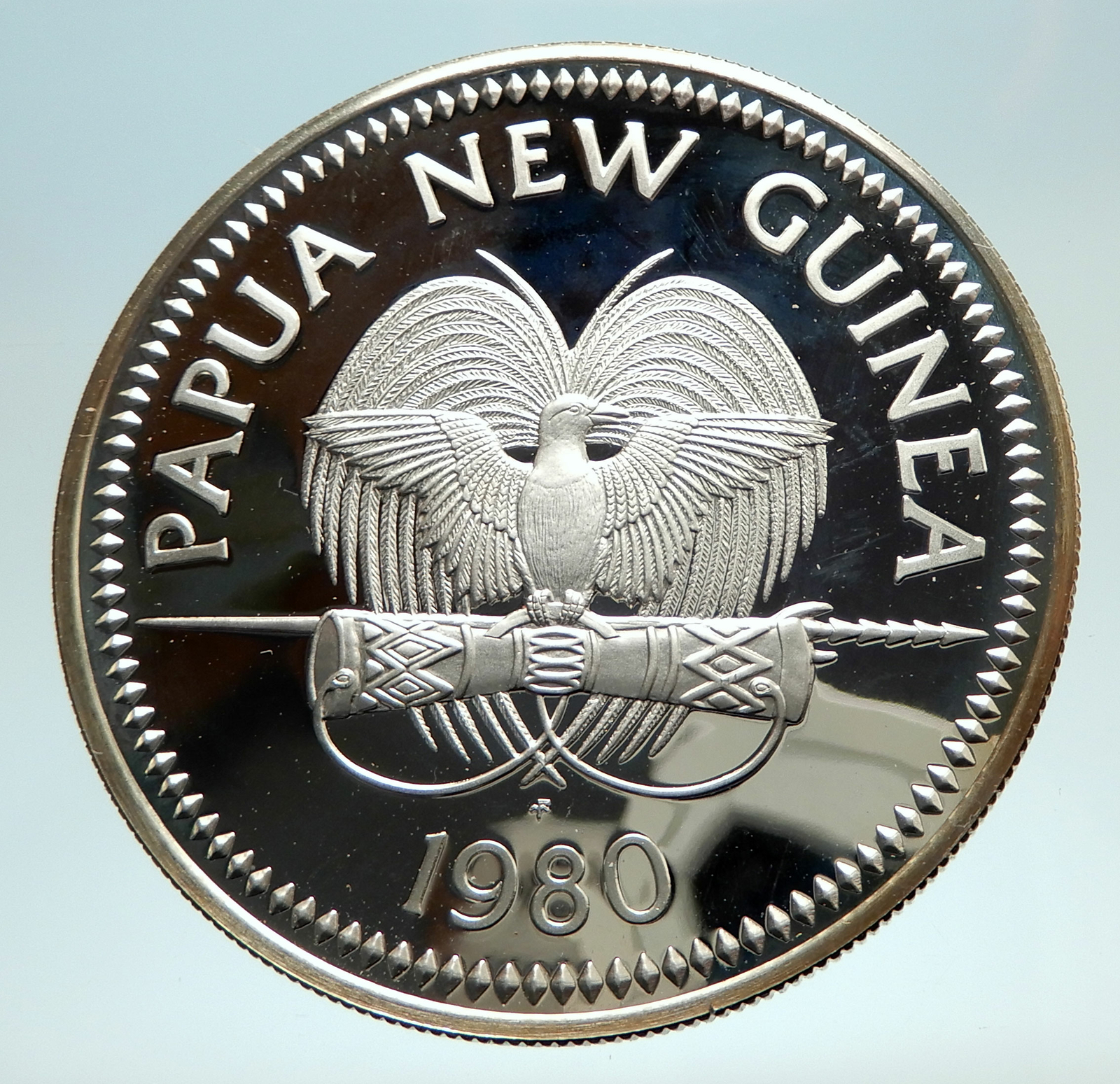 Description: 1976 Proof Silver 10 Kina 45mm (41.47 grams) 0.925 Silver (1.2372 oz. Its capital, located along its southeastern coast, is Port Moresby. The western half of New Guinea forms the Indonesian provinces of Papua and West Papua. ).
