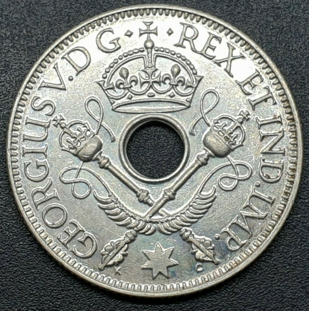 Description: ·ONE SHILLING·1936·. Lettering: GEORGIUS V.D G· ·REX ET IND·IMP·. TERRITORY OF NEW GUINEA. Engraver: George Kruger Gray. Crown over crossed sceptres, lettering around.