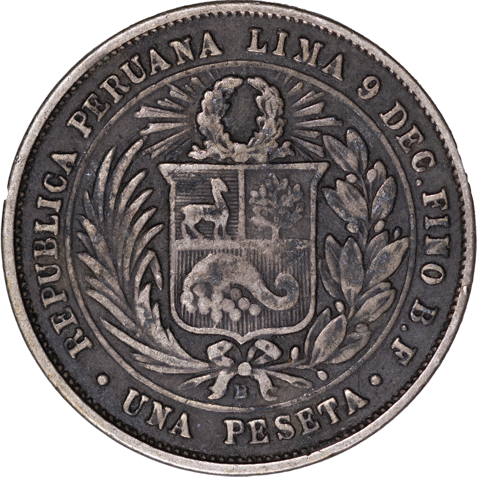 Description: 1880 Peruvian One Peseta, 90% Silver 5g – “Prosperidad y Poder” ~ Circulated