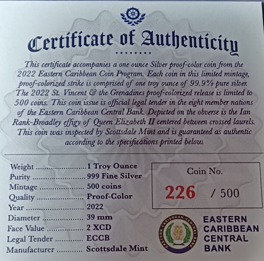 2022 1OZ Colorized Silver Coin. St. Vincent and The Grenadines. Ship. .999 Fine