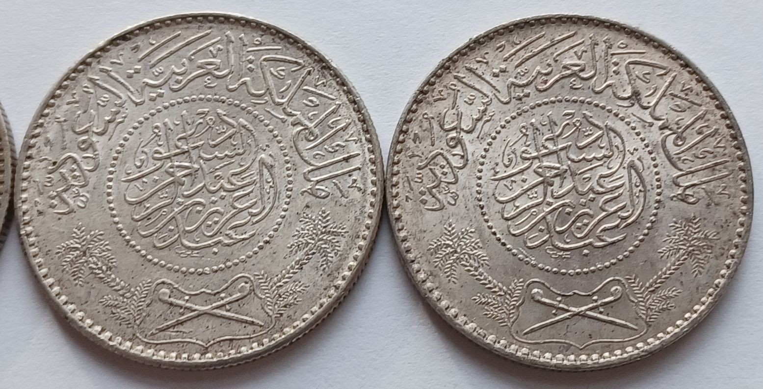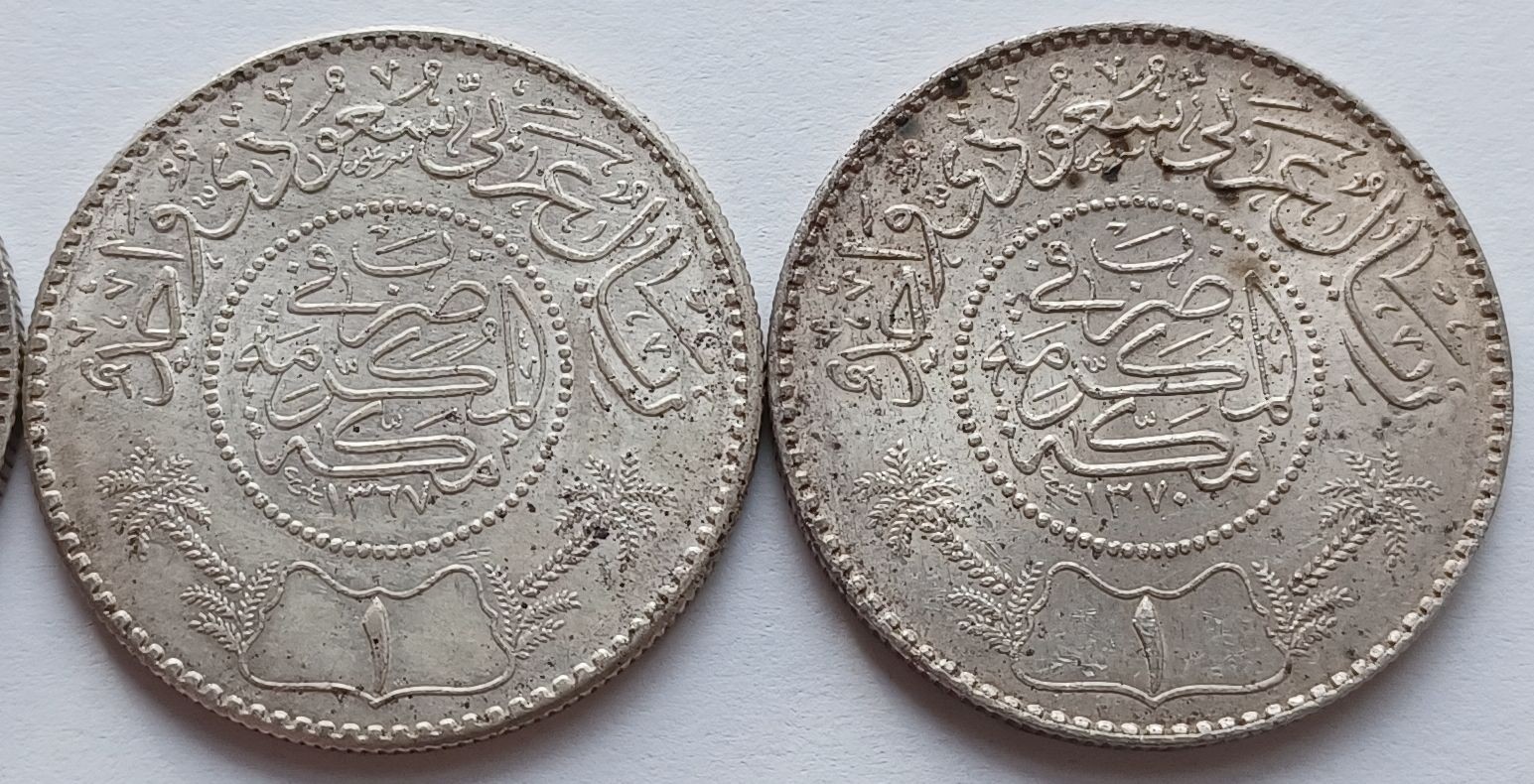 Description: Lot of 3 Saudi Arabia 1 Riyal Silver Coins UNC, minted in AH 1354 (1935), AH 1367 (1948), and 1370 AH (1951). The item pictured is authentic and is the item you will receive.