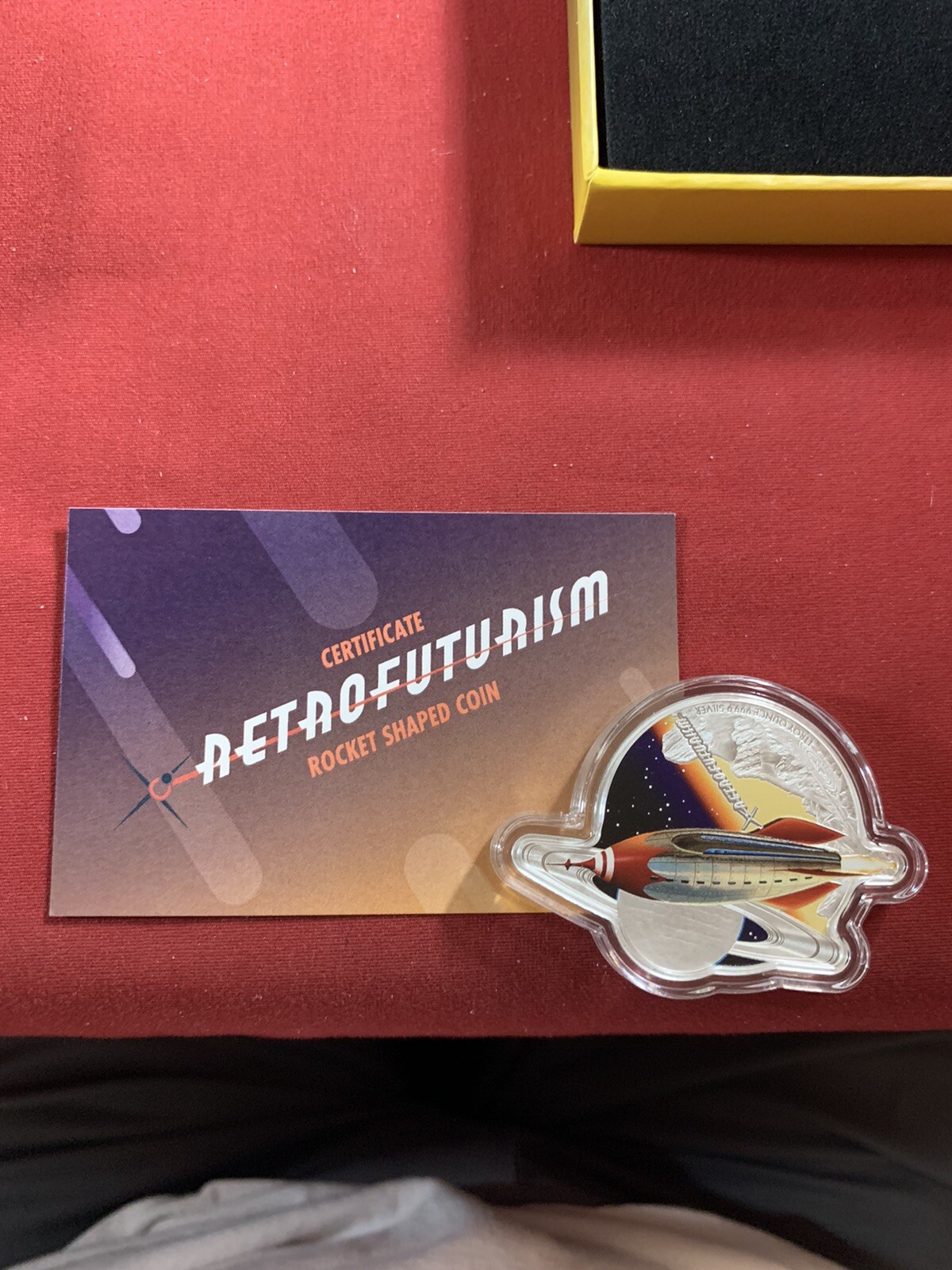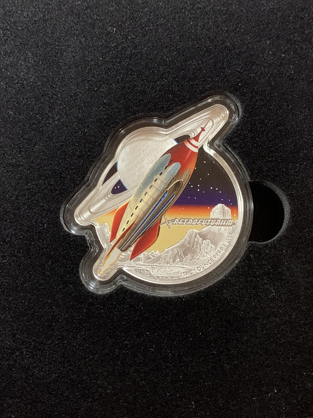 Description: 2021 Solomon Islands $2 – Retrofuturism Rocket – PAMP Suisse (1oz Silver). Mintage of 2500 Proof Like