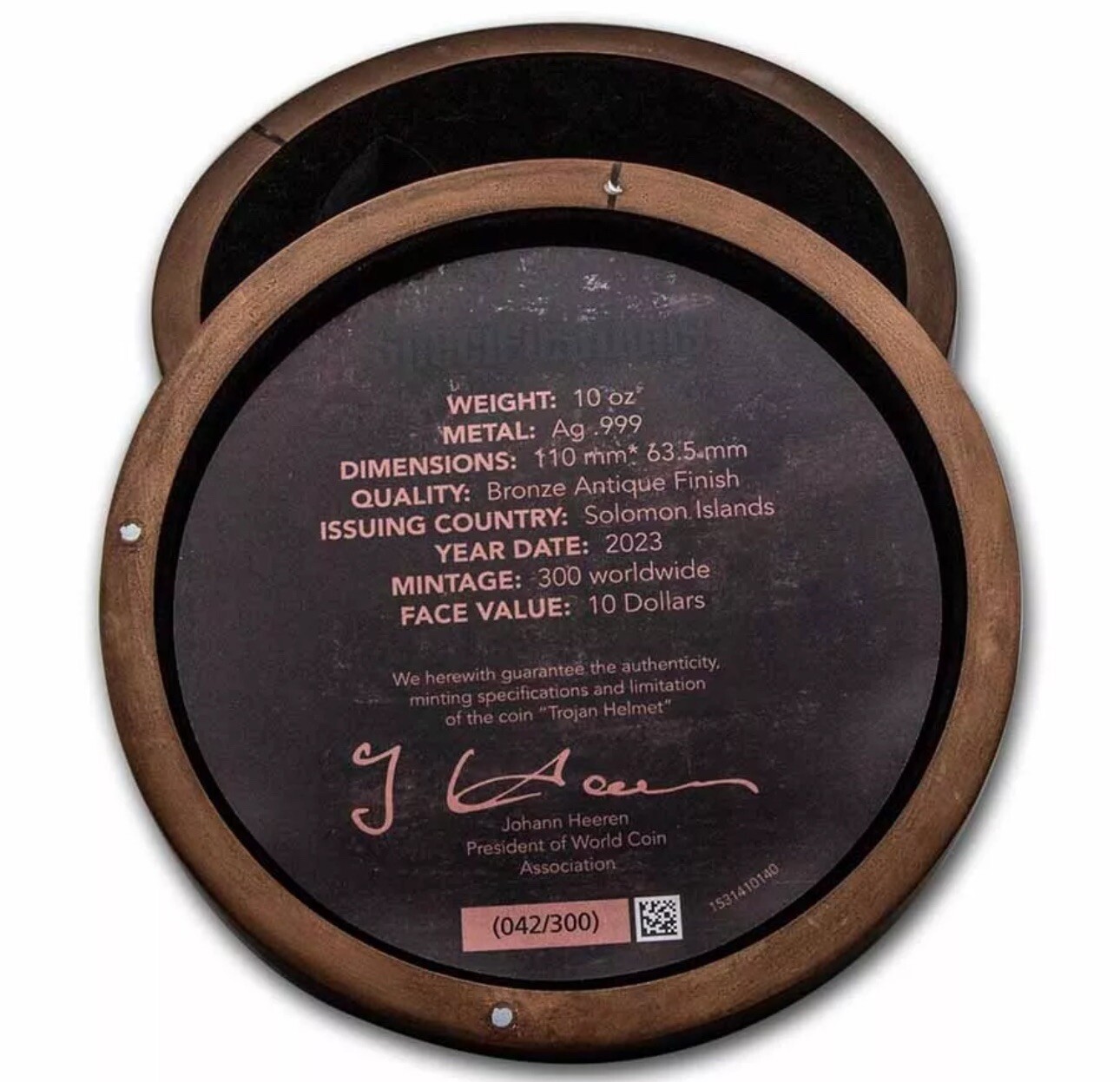 Description: 2023 10 oz Antique Solomon Islands Silver Trojan Helmet Coin (Box, CoA). Shipped with USPS Ground Advantage.