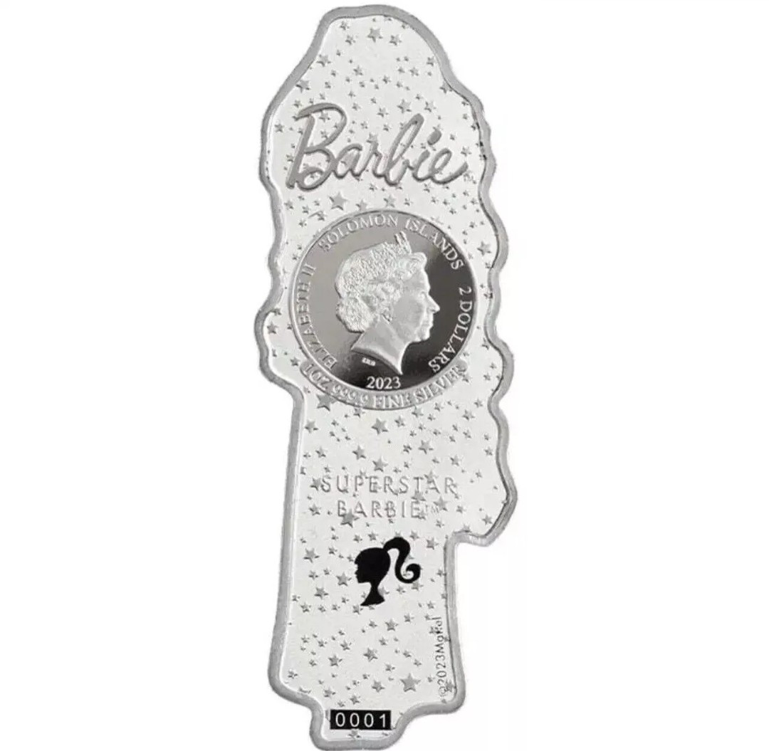 Description: The product is a 2023 Solomon Islands 1 oz Superstar Barbie Silver Coin featuring a denomination of $2. It is composed of 0.9999 fine silver and has a Proof-Like/Colorized strike type. The coin is minted by Pamp Suisse and does not have a certification.