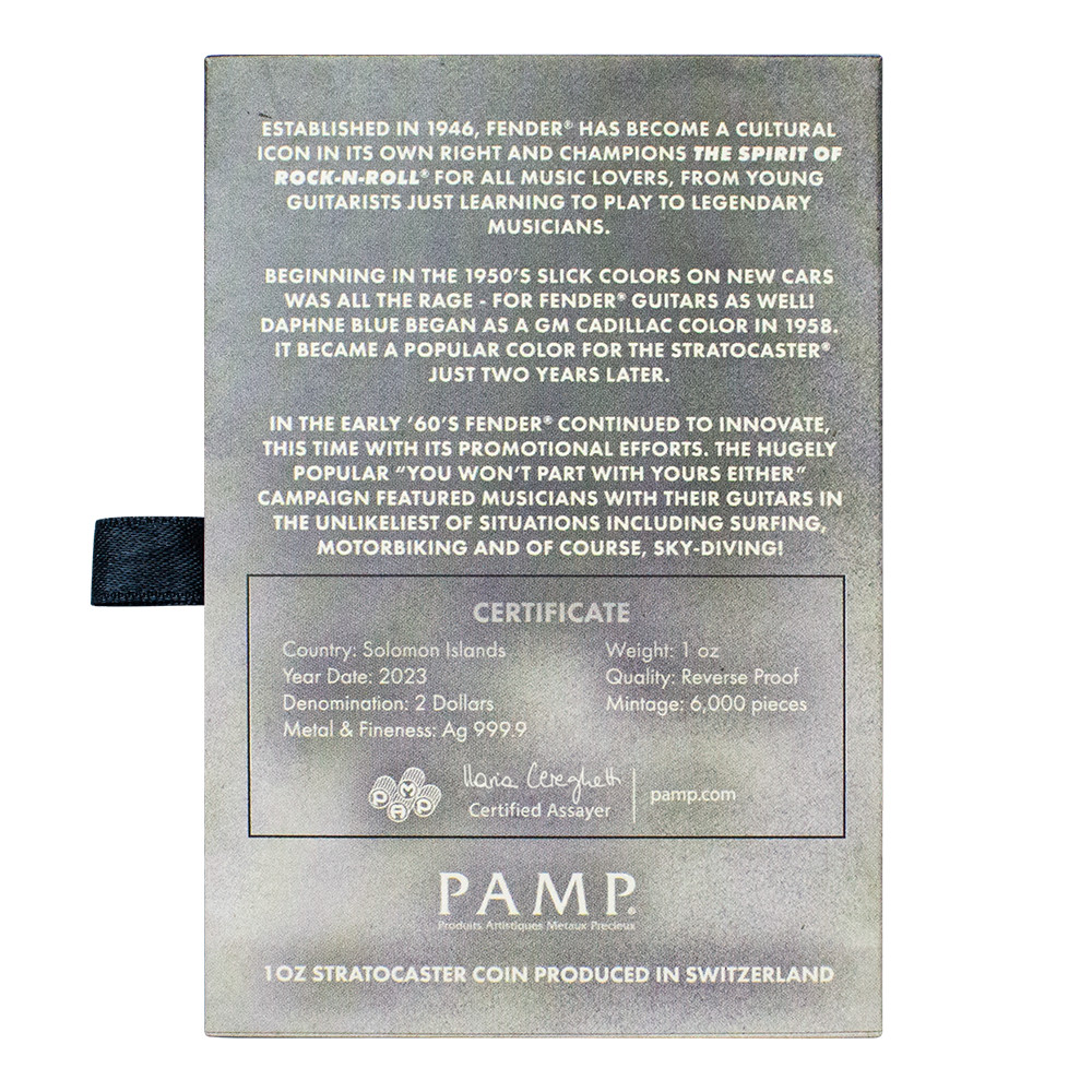 Description: Up for sale is a2023 Solomon Islands Fender Stratocaster Daphne Blue Guitar Shaped 1oz. 999 Silver Coin made by PAMP SUISSE. Serial number will vary (if applicable).