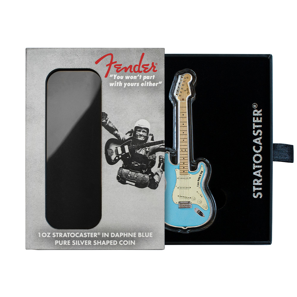 FENDER STRATOCASTER DAPHNE BLUE 2023 1 oz Silver Guitar Coin Solomon Islands