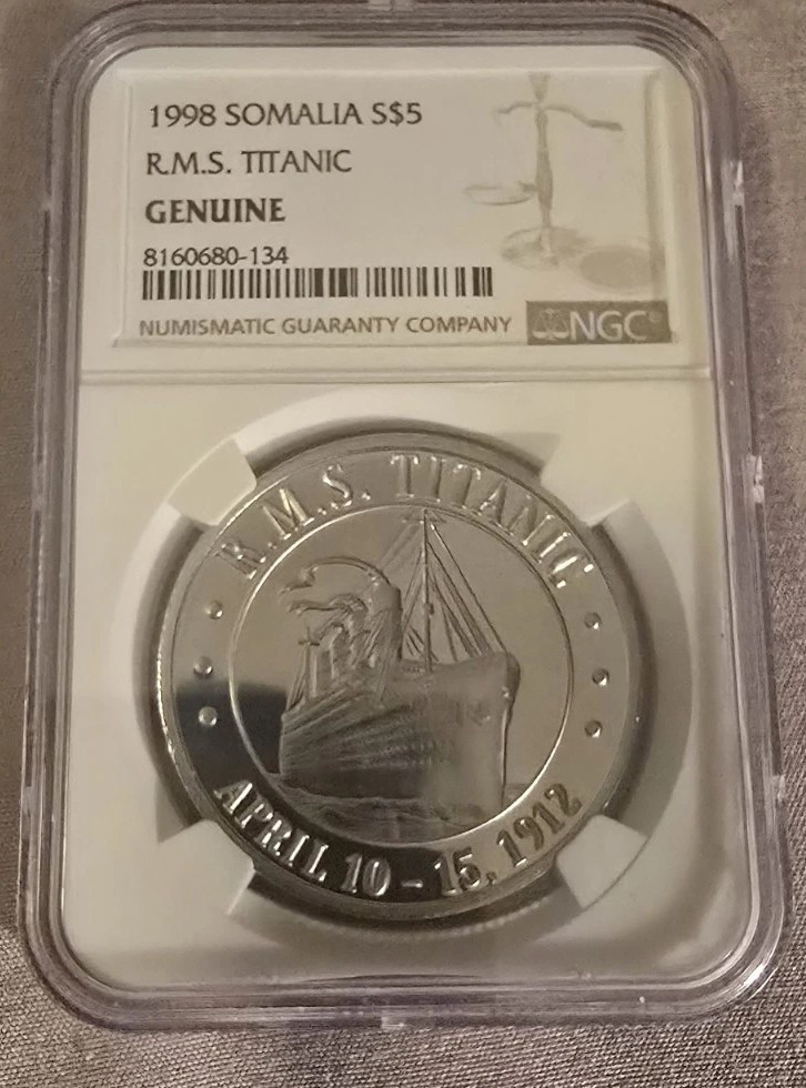 Description: The 1998 Somalia S$5 R.M.S Titanic coin is a genuine NGC-certified coin minted in copper-nickel. It features a design commemorating the famous shipwreck, with the certification ensuring its authenticity. This uncirculated coin originates from Somalia and holds a special significance for collectors interested in world coins and maritime history.