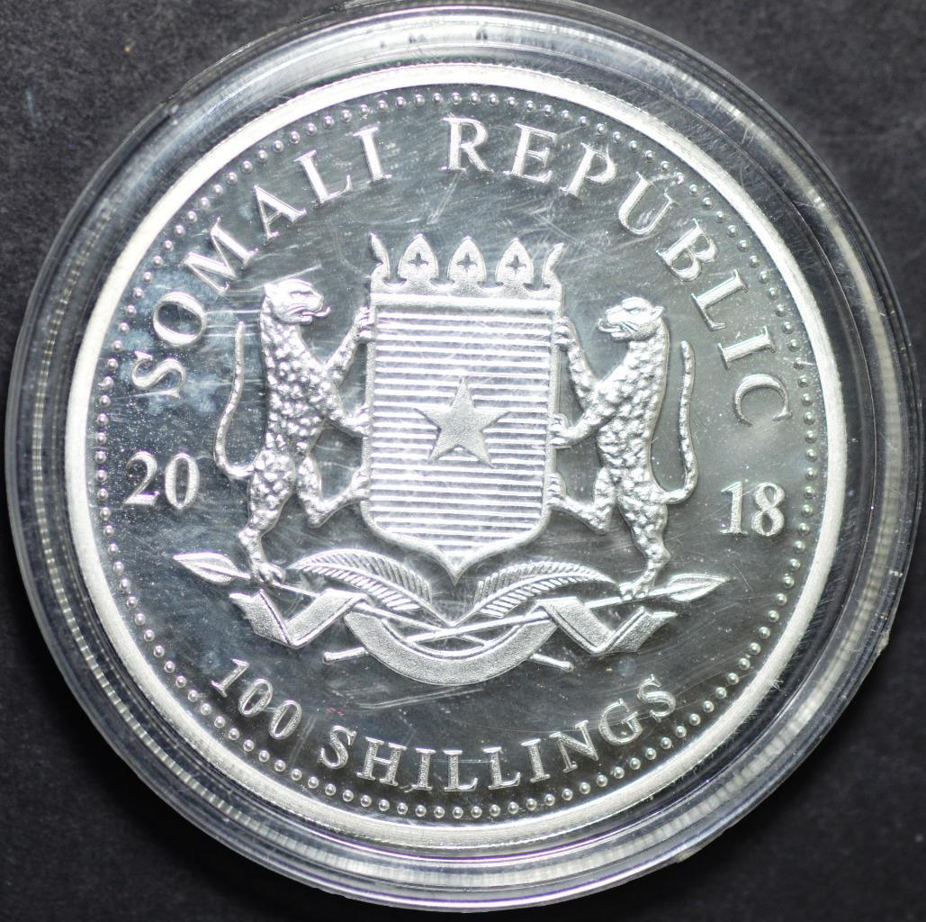 Description: 2018 Somalia, 100 Shilling, African Wildlife, Elephant, 999 Silver, Munich Mint, KM# 286.