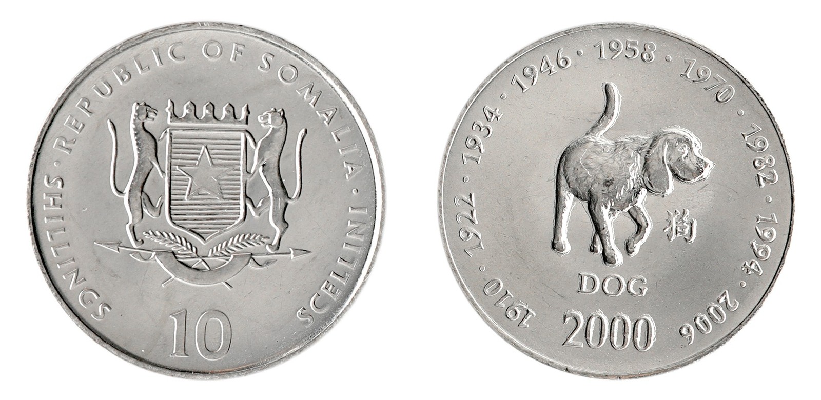 Description: This 10-Shilling coin from Somalia is a non-circulating coin issued in 2000 as part of the Asian astrology series. It is a nickel-clad steel coin that is in mint condition, weighs 4.82 g, and has a diameter of 25 mm. Its obverse side shows the national coat of arms. Its reverse side features a dog.