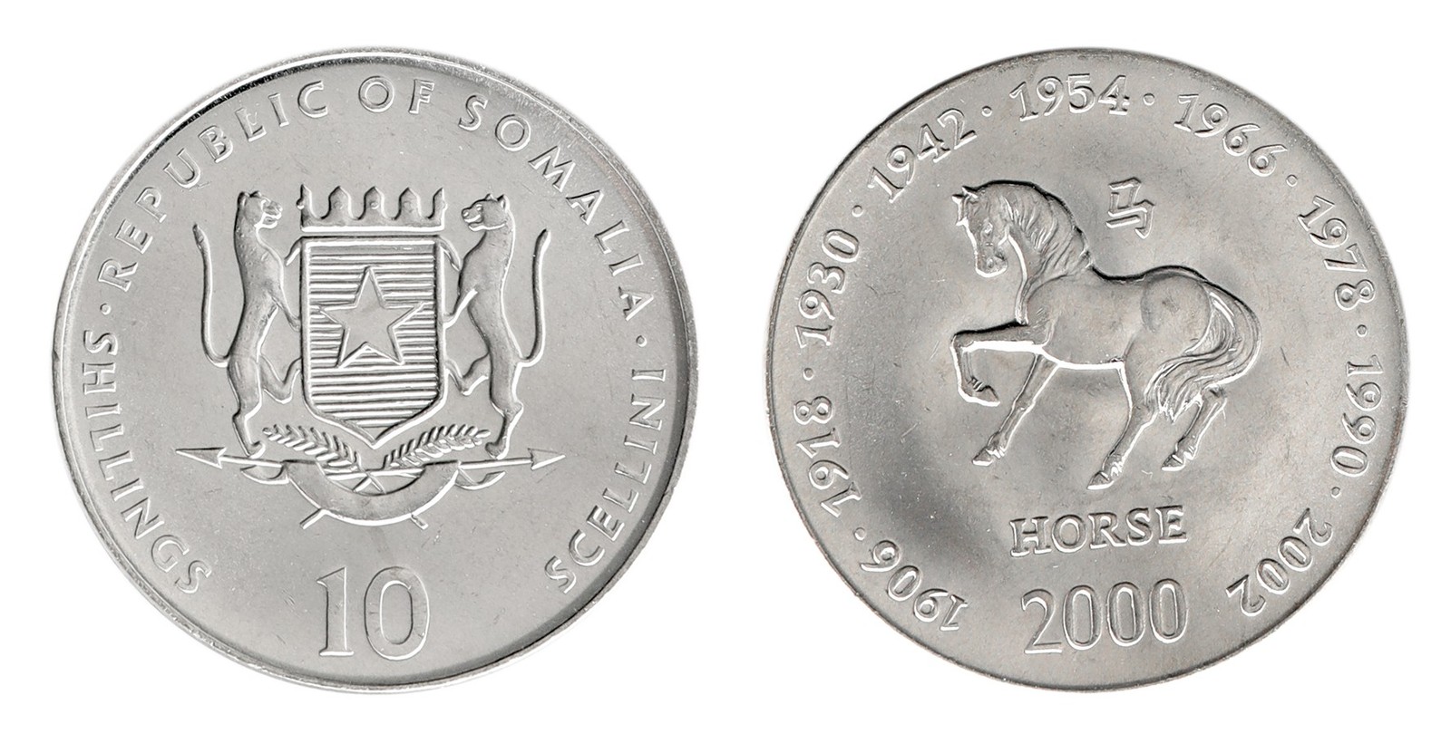 Description: This 10-shilling coin from Somalia is a non-circulating coin issued in 2000 as part of the Asian astrology series. It is a nickel-clad steel coin that is in mint condition, weighs 4.82 g, and has a diameter of 25 mm. Its obverse side shows the national coat of arms. Its reverse side features a horse.