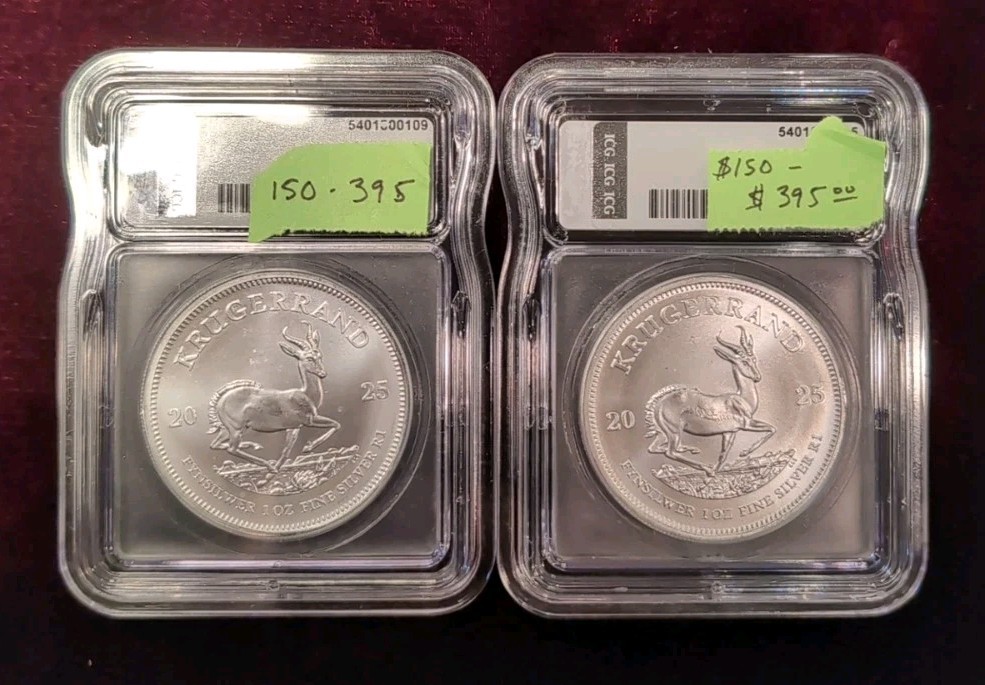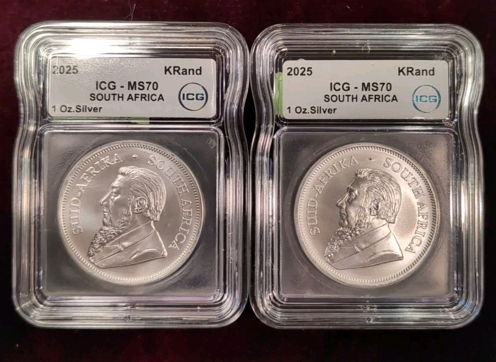 Description: The product is a set of two 2025 South African Silver Krugerrand coins, each weighing 1 oz and graded MS70 by ICG. These coins are composed of 0.9999 fineness silver and are uncirculated. They are minted by the South African Mint in featuring the South African Kruggerand design. This set contains a total of 2 troy ounces of silver content per unit.