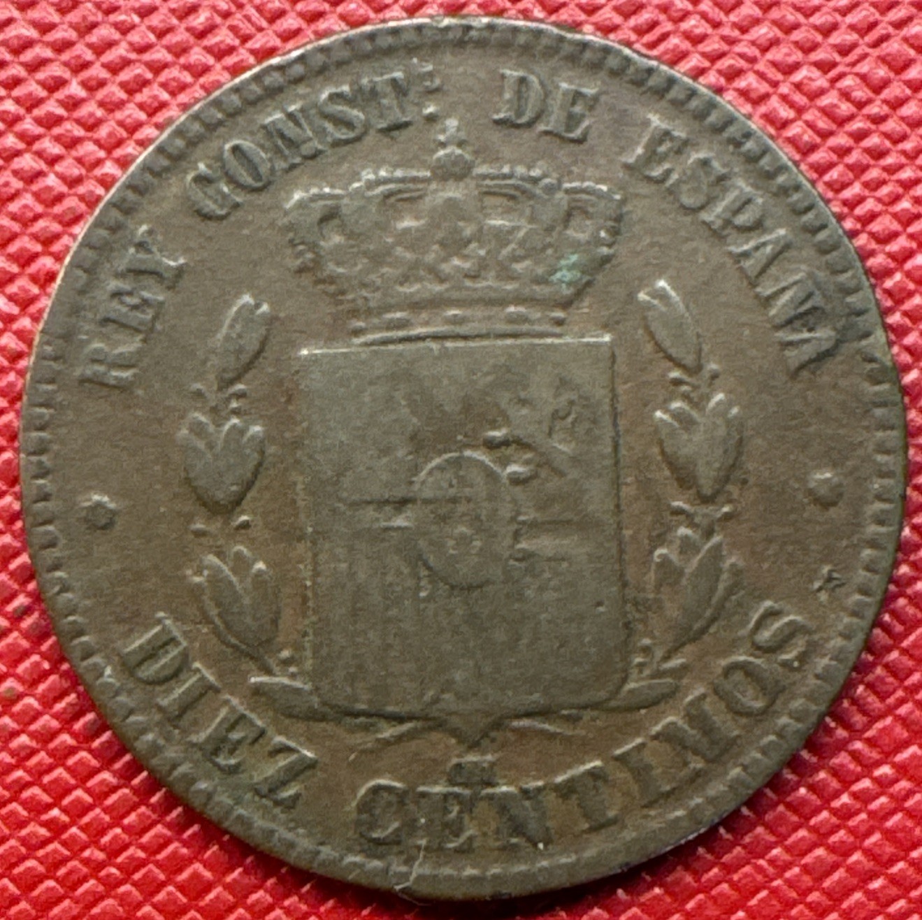 Description: Spain 1879-OM Bronze 10 Centimos. Alfonso XII. KM# 675. Barcelona Mint. Mintage: 56,313,000. Diameter: 30 mm.