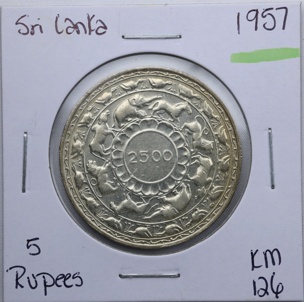 Description: Value 5 Rupees. 1957 Sri Lanka Ceylon. Buddhism Anniversary. References KM# 126. Silver Coin 0.925. Thickness 2.5 mm. Shape Round. Composition Silver (.925).
