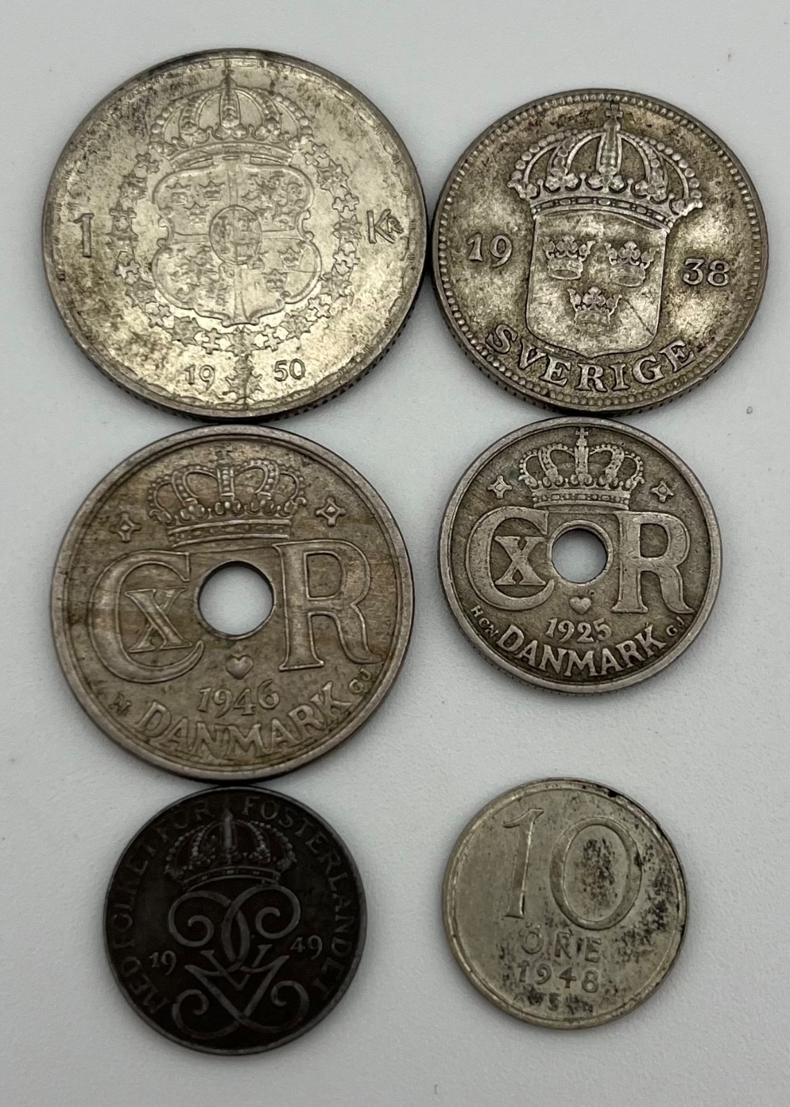 Description: 1925 – 1950 Sweden Coins Small Lot Of 6 Coins 1 KRONA 50-25-10-10-1 ORE