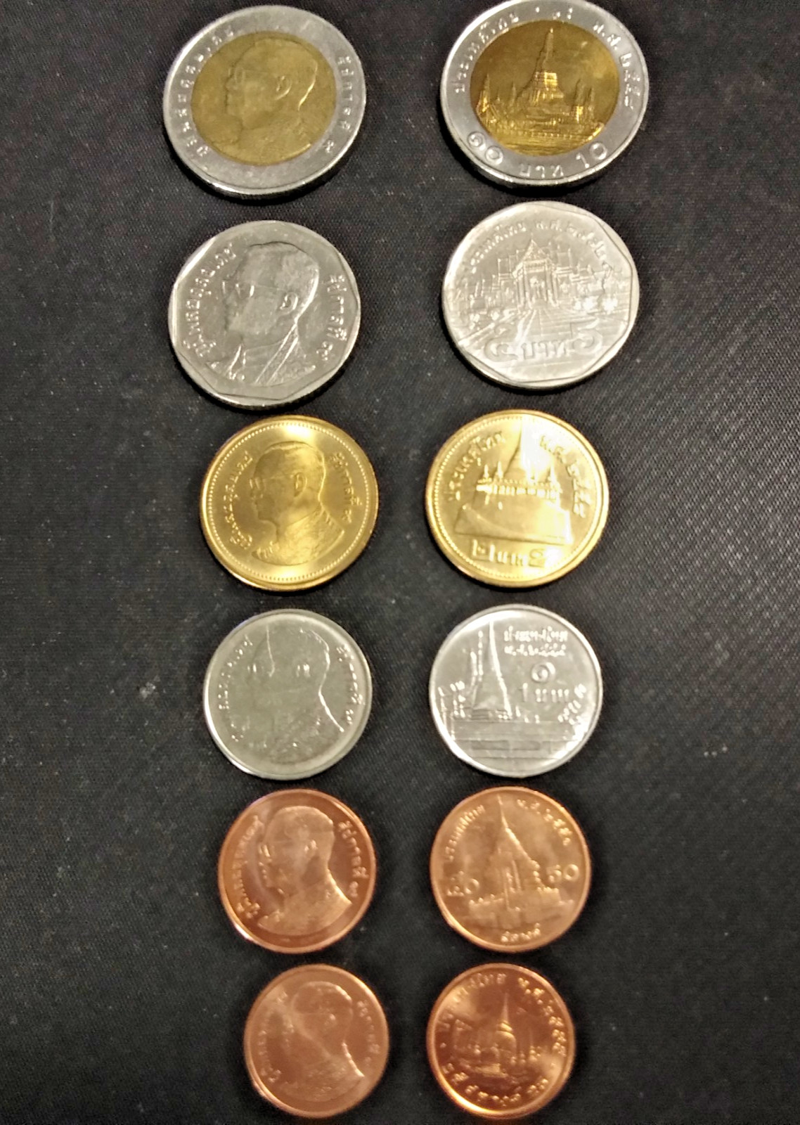 Description: This set of Thailand coins was made in various years in various values from 25 Satang to 10 Baht. They show different images on the back and front of each coin. However, each one has an image of King Rama 9.