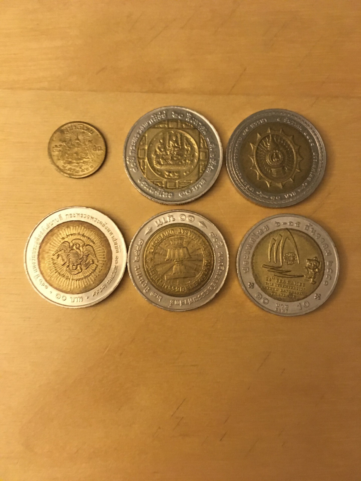 Description: 6 Coins from Thailand. – 10 Baht 2002 75th Anniversary of the King very fine.