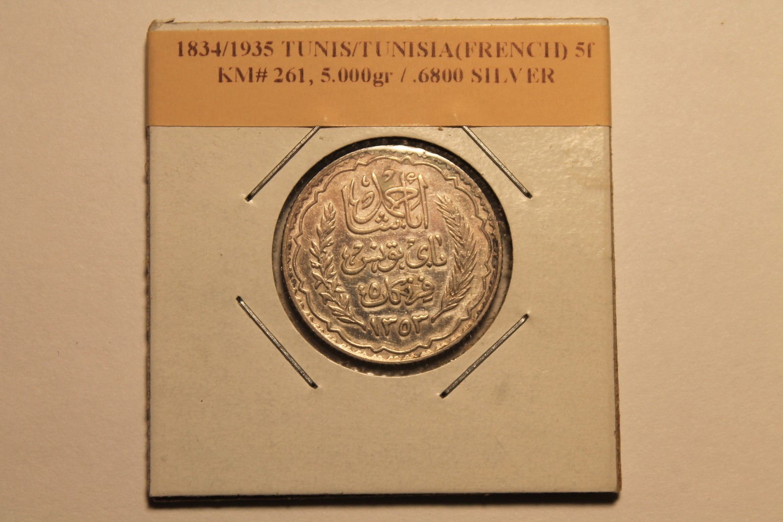 Description: 1935 / 1353 Tunisia 5 France. See pictures for the exact coin you will receive.