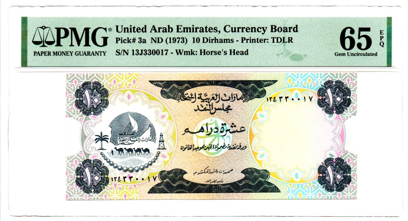 Description: United Arab Emirates: Currency Board 10 Dirhams ND (1973) Pick 3a PMG Gem Uncirculated 65 EPQ.