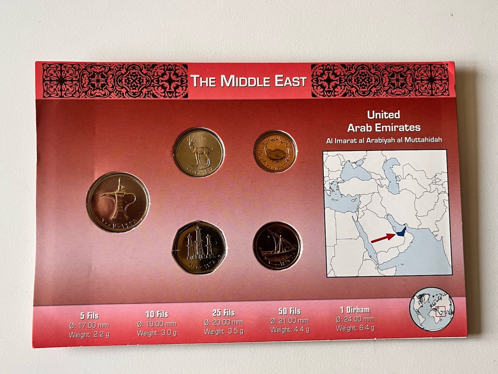 Description: The United Arab Emirates 5 Coins Set includes coins in denominations of 5, 10, 25, 50 Fils, and 1 Dirham. These coins are uncirculated and sourced from the United Arab Emirates.