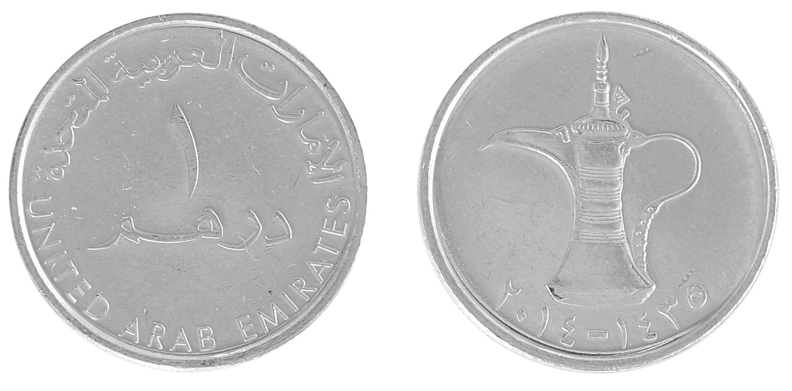 Description: This copper-nickel dirham coin from United Arab Emirates is in mint condition. It weighs 6.1 g and has a diameter of 23.8 mm. One side of the coin shows the face value and country name in Arabic. The other side of the coin, engraved by Geoffrey Colley, portrays a traditional Arabic coffee pot known as the dallah.